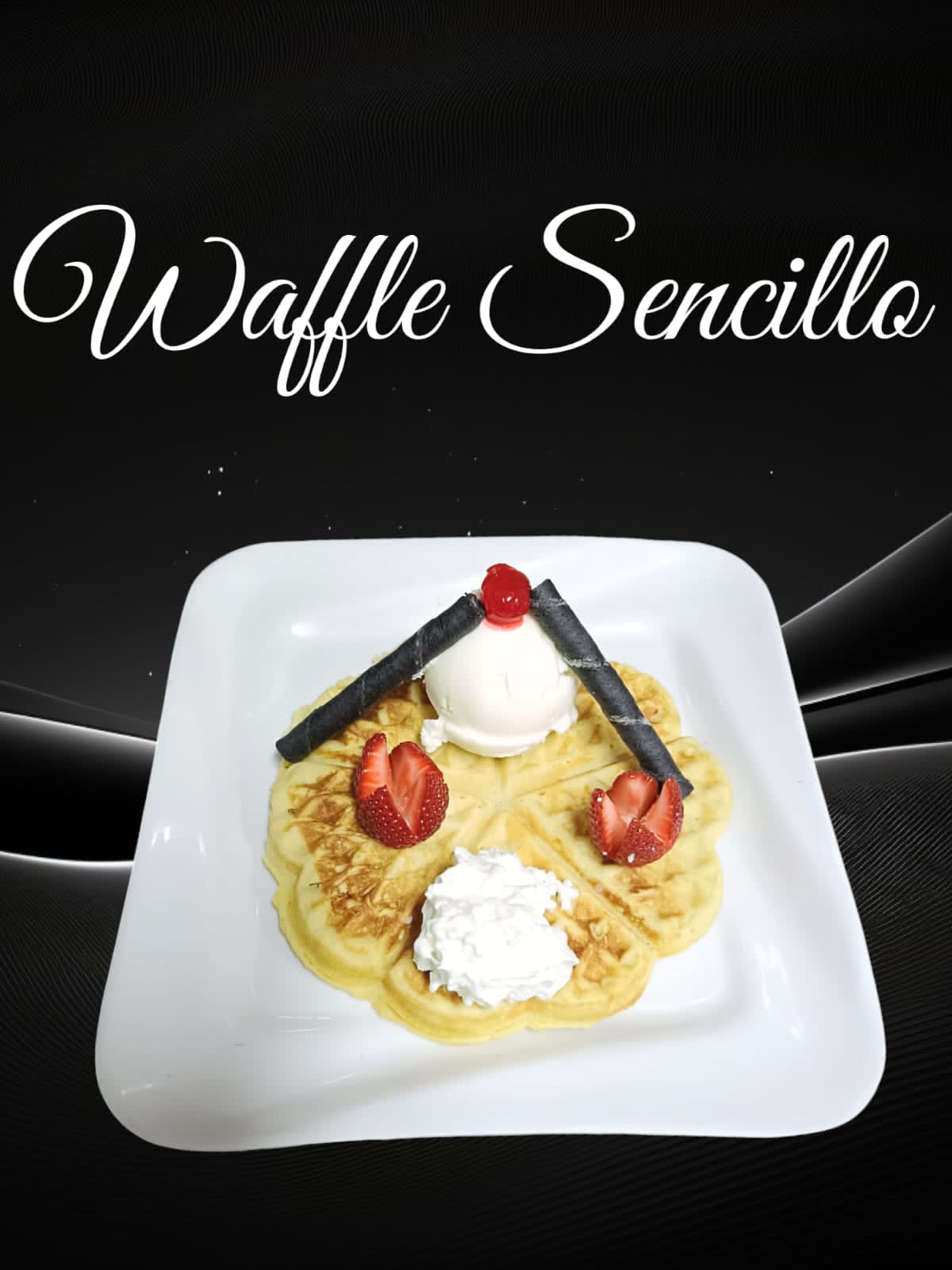 Waffle, 1 bola de helado, crema de leche, 2 fresas, cereza y barquillos.