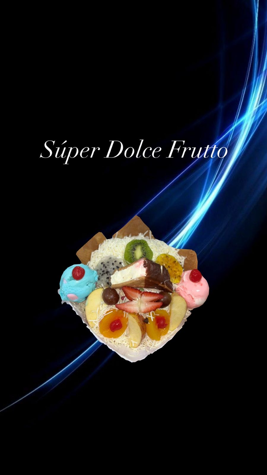 Ensalada Super Dulce, banano, papaya, fresa, mango, piña y manaza, crema de leche, queso, kiwi. pitaya, higo, 2 porciones de durazno, 2 uvas moradas, cereza, 2 bolas de helados y media porcion de galleta de helado y barquillo. 32 Oz
