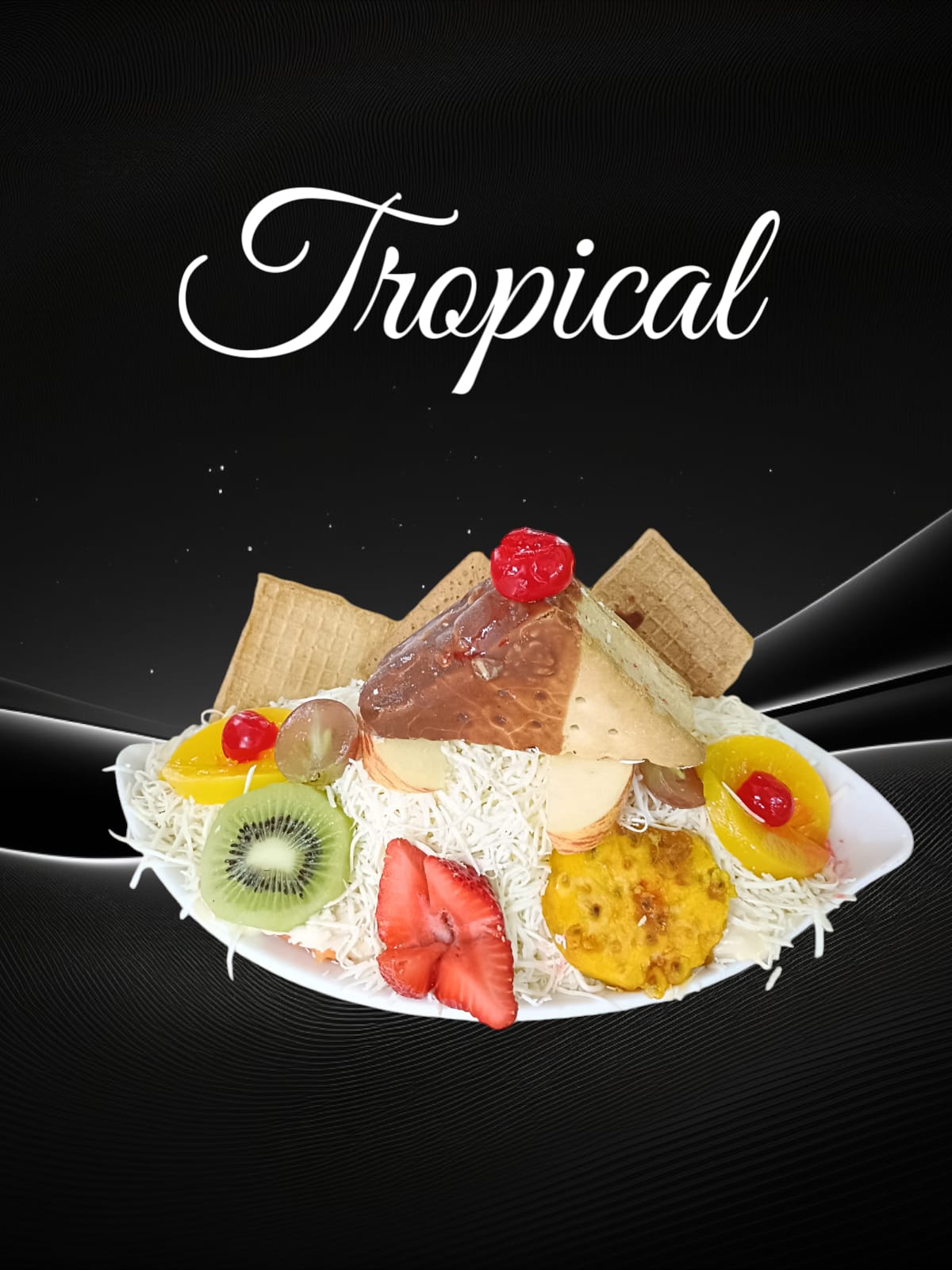 Waffle, fresas, banano, kiwi, durazno, cerezas, uvas, bola de helado, crema Chantilly, miel y barquillos.