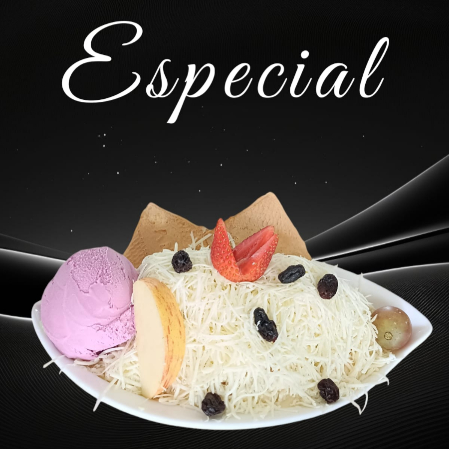 Ensalada Super Dulce, banano, papaya, fresa, mango, piña y manaza, crema de leche, queso, kiwi. pitaya, higo, 2 porciones de durazno, 2 uvas moradas, cereza, 2 bolas de helados. 32 Oz