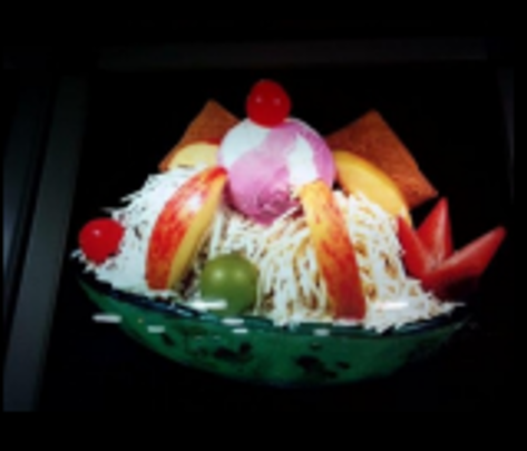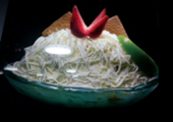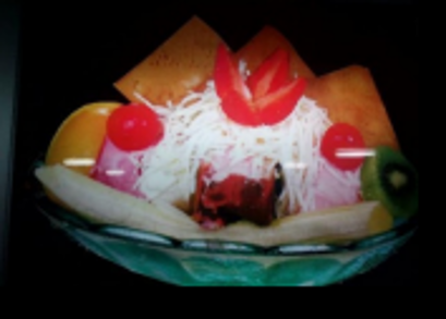 Deliciosa banana split con crema de leche, 2 bolas de helado de vainilla, fresa, medio platillo, queso campesino rallado, fresa, kiwi, durazno, cereza, uva y galleta.