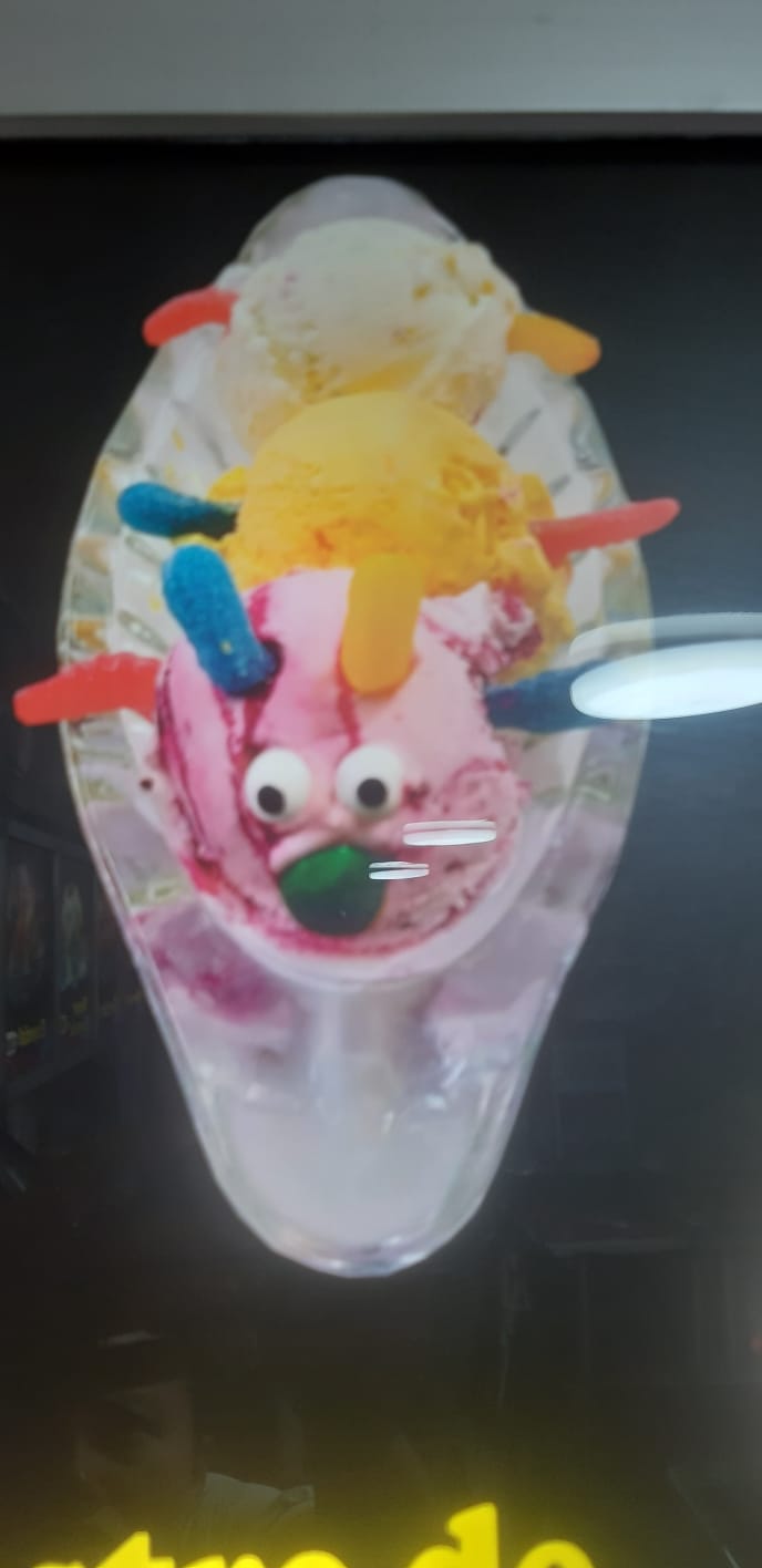 Delicioso postre de gusanito con 3 bolas de helados (fresa, vainilla, mora), gomitas trululu y ojos comestibles.