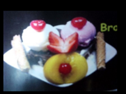 Delicioso brownie de helado con crema de leche, 2 helados de vainilla y fresa, uva, kiwi, durazno, cereza, 2 barquillos y galleta crocante.