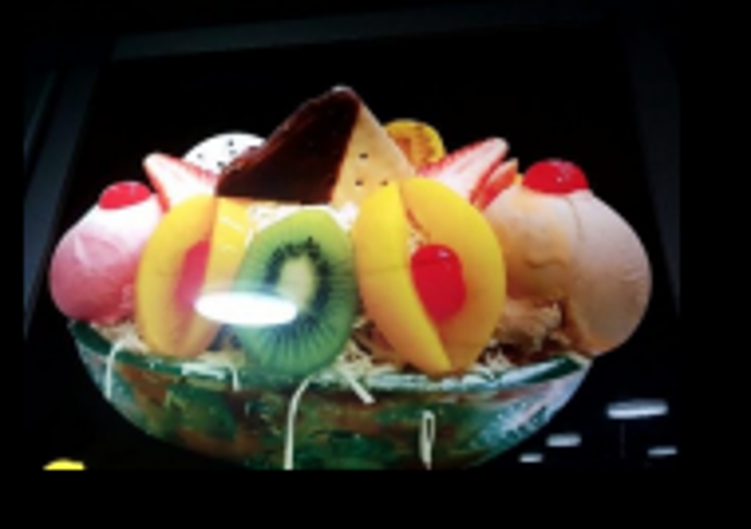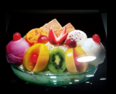 ensalada de frutas super especial (banano, papaya, piña, mango, fresa, manzana) con crema de leche, queso campesino, y una selección de fresa, uva, breva, durazno, kiwi, pitaya, cereza y una galle + Ensalada Júnior: Deliciosa mezcla de fruta picada (banano, papaya, piña, mango, fresa, manzana) y crema de leche, decorada con queso campesino rallado, fresa, uva, 1 helado pequeño y galleta crocante.
