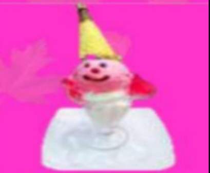 Delicioso payasito de helado decorado con 2 bolas de helado de vainilla y fresa, grajea y cereza.
