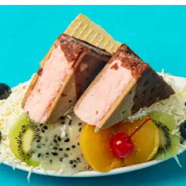 Gelatina con crema de leche, helado, queso, fresa, barquillo y galleta.