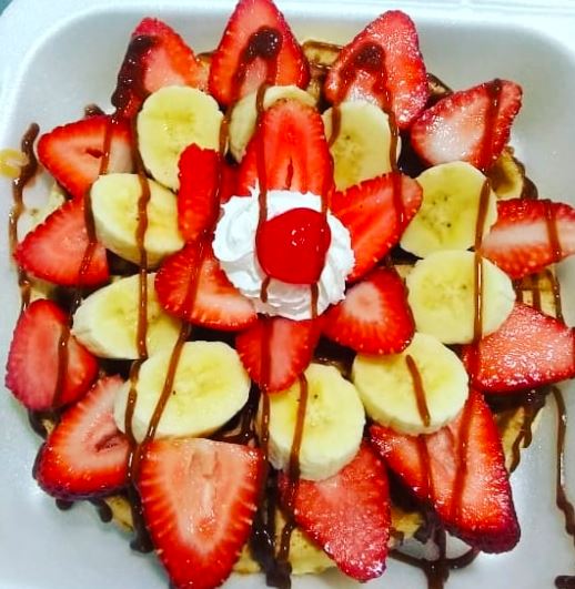 Base waffle sabor a vainilla, salsa maple, arequipe, chocolate, relleno de fresa y banano, un sabor de helado.