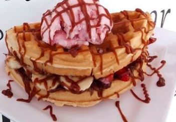 Base waffle sabor a vainilla, salsa maple, arequipe, chocolate, fresa, banano, chantilly y cereza.