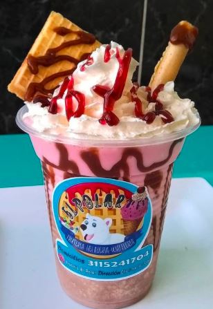 Malteada 16 onzas ,un sabor de helado, chantilly, fresa, barquillo y grageas.