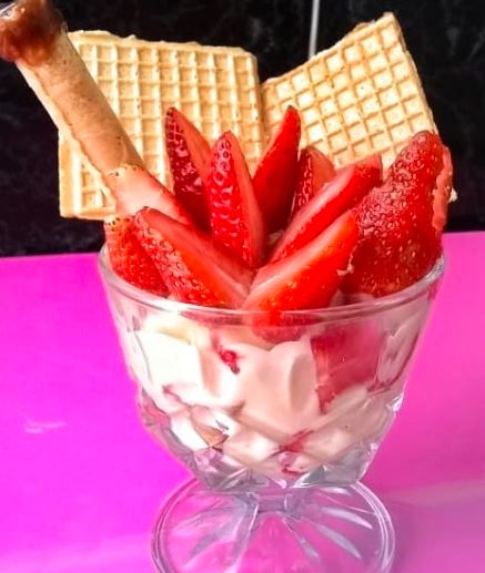 HELADO DE FRESA, CREMA CHANTILLY, BARQUILLO, FRESA, DULCE DE MORA DE PISO Y CHISPAS EN VASO DE 14 ONZAS