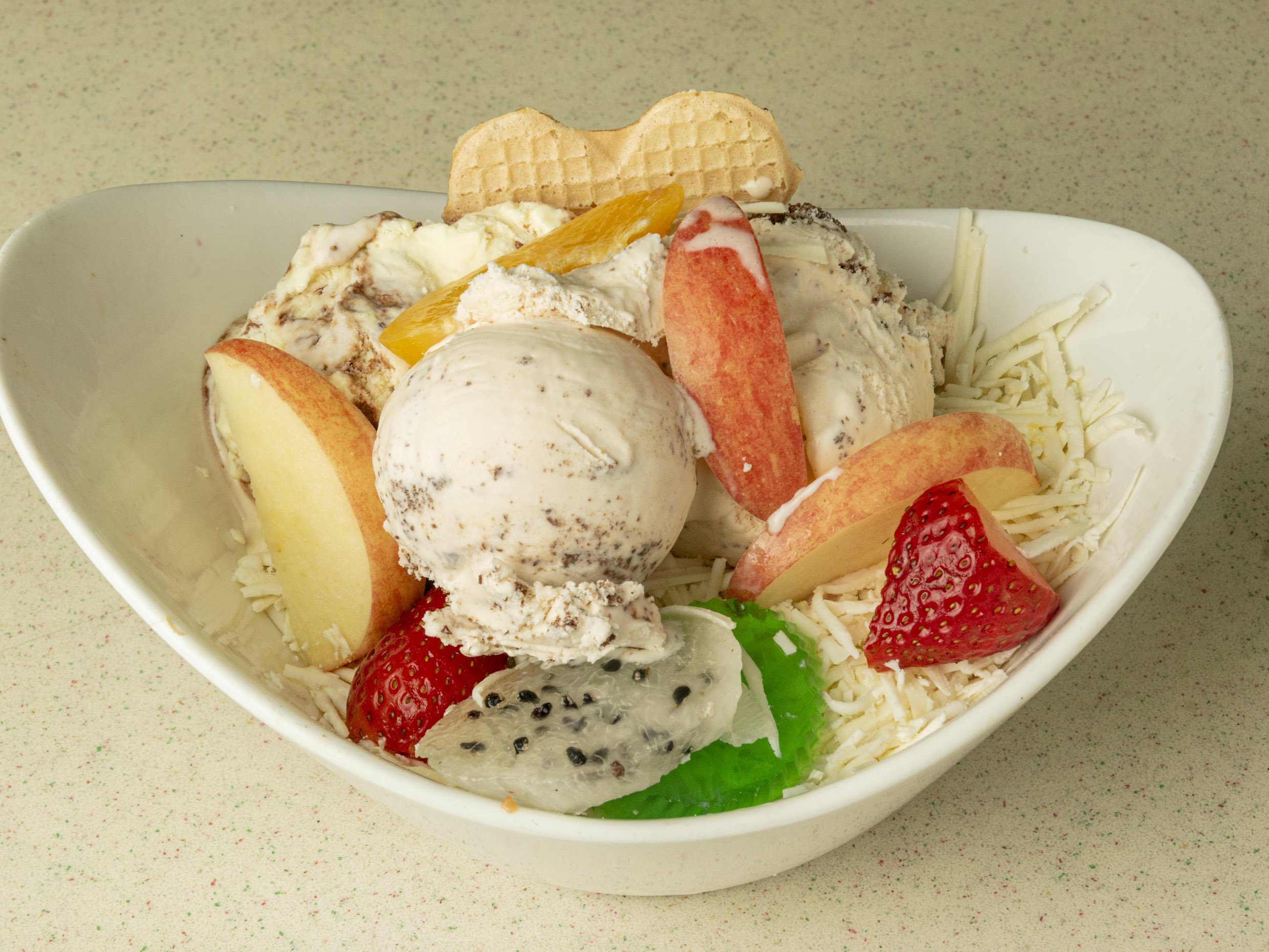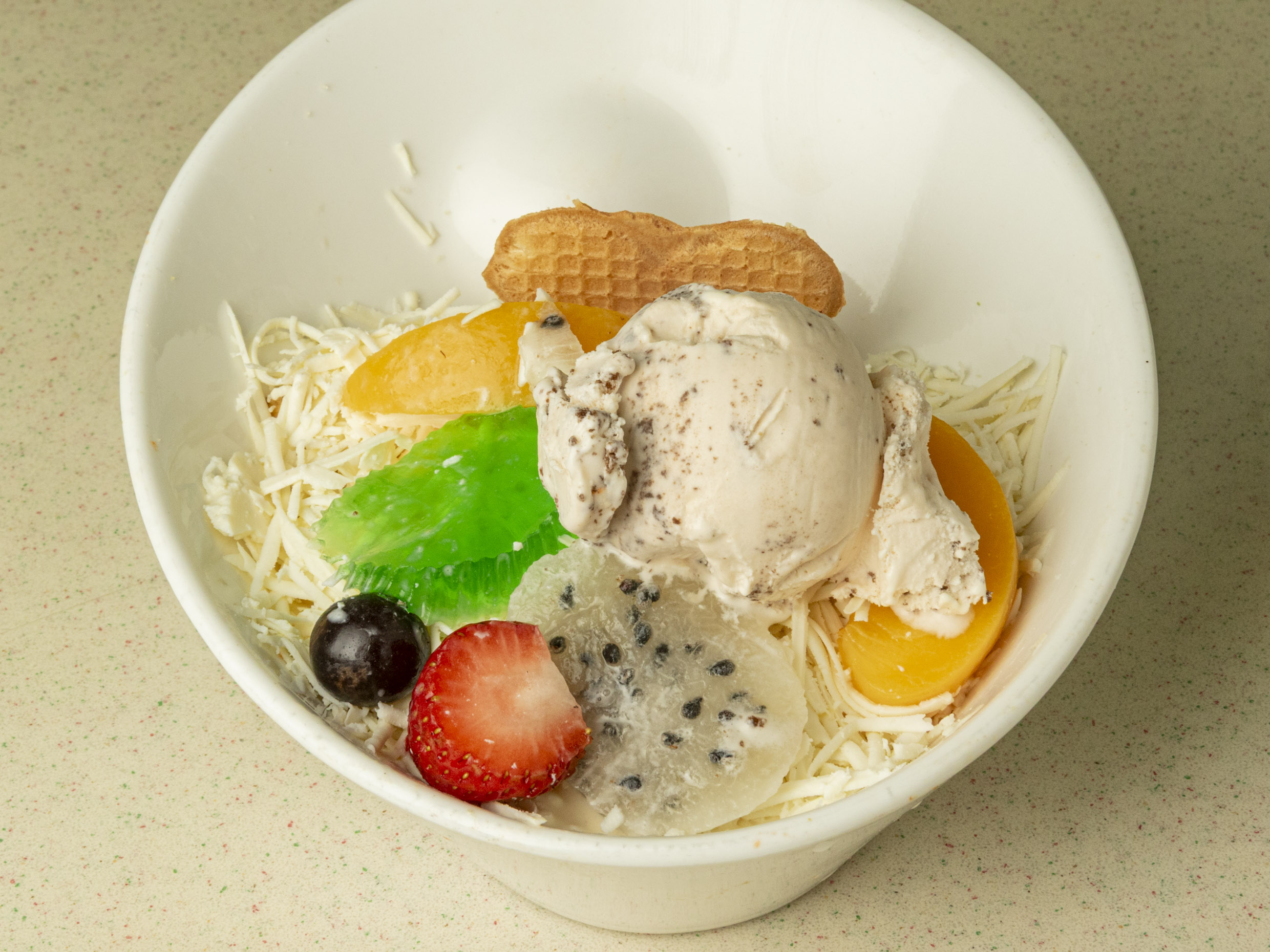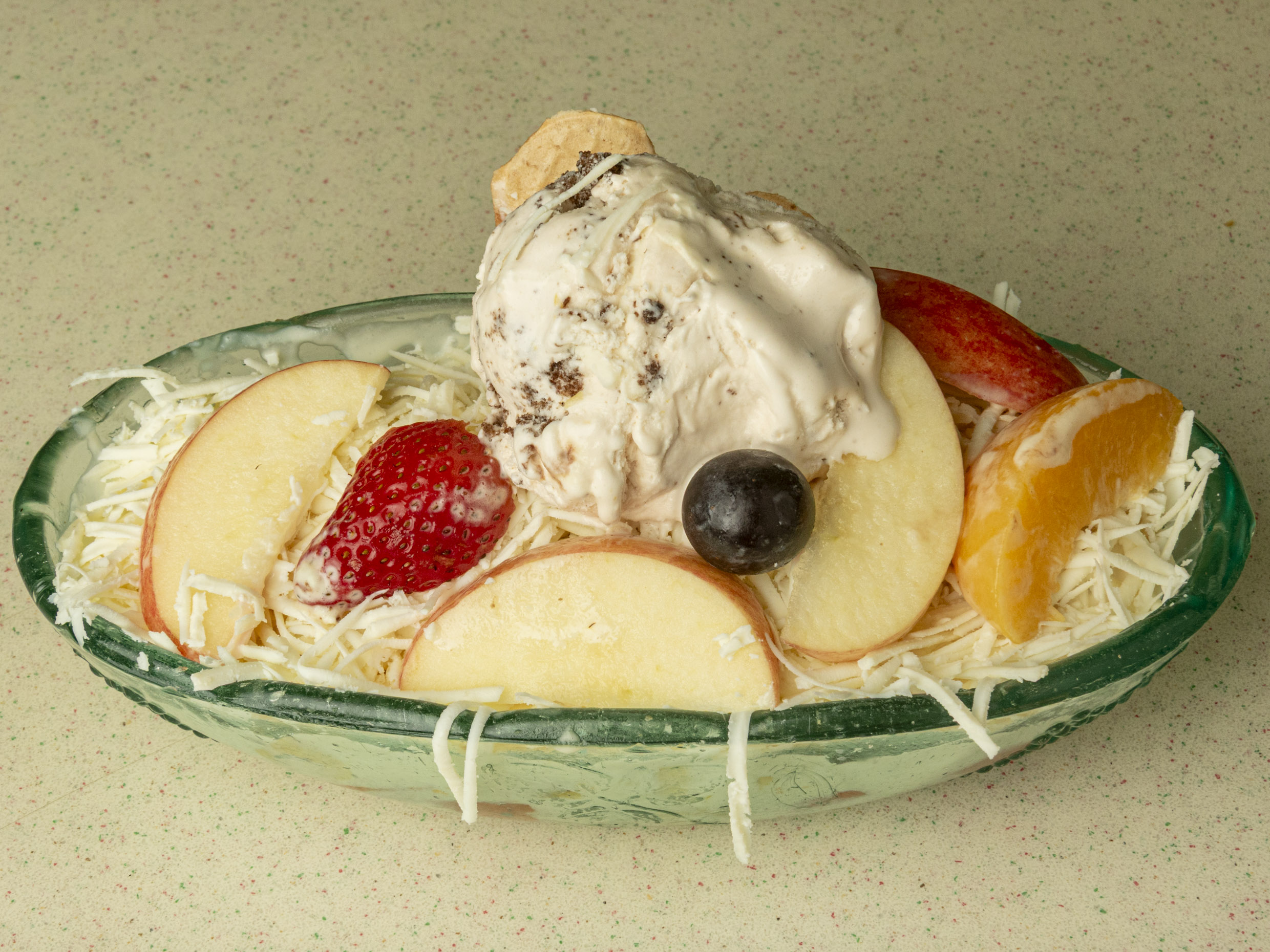 Fruta picada (papaya, banano, manzana, melón, fresa), crema de leche, queso y bola de helado del día.