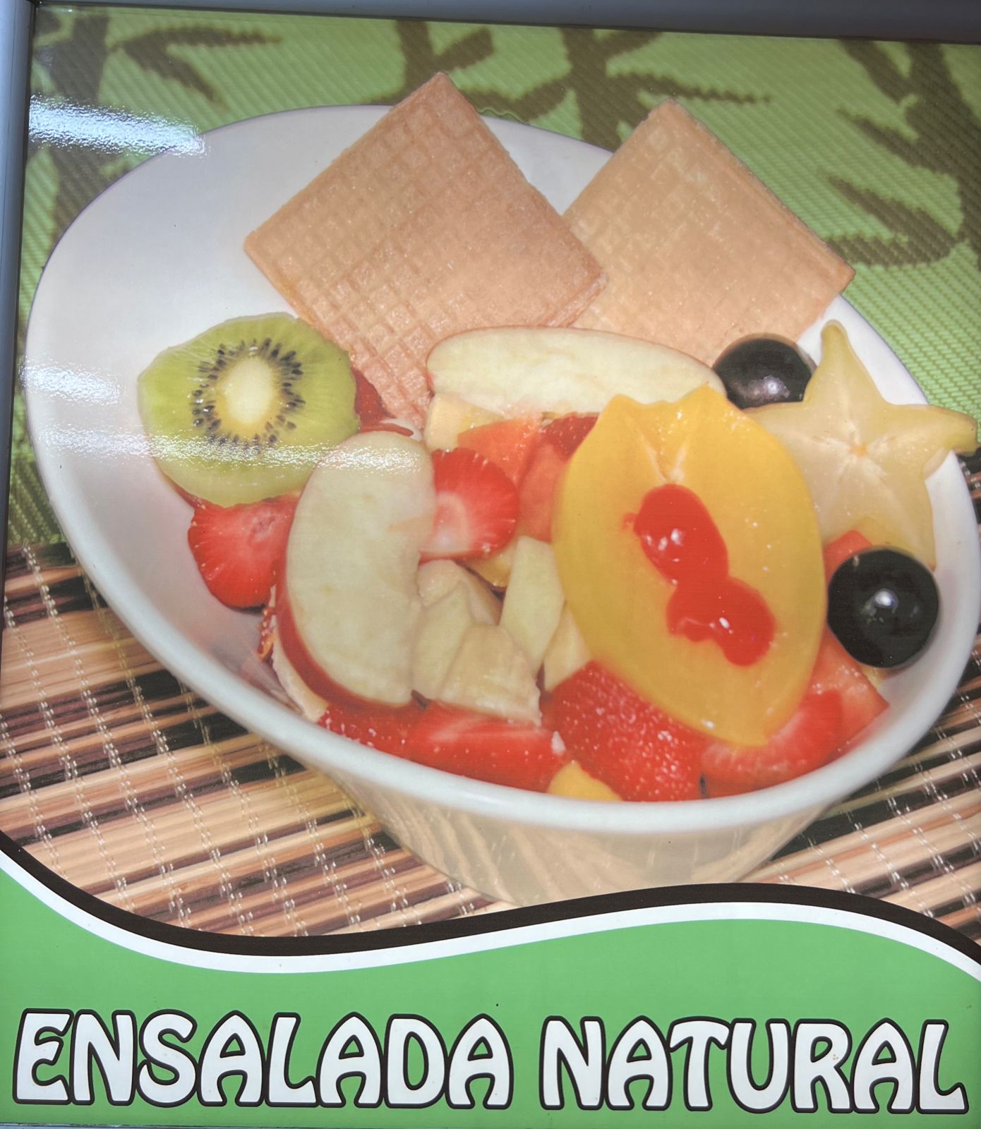 Fruta picada (papaya, banano, manzana, melón, fresa), crema de leche, queso, uva, kiwi, durazno, cereza, pitaya y galleta con helado del día.