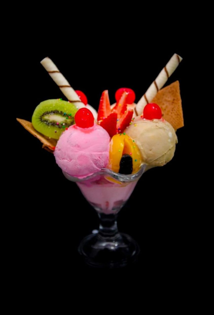 500gr de Fresas picada, 1 Porcion de Helado, Topping y Salsa de tu preferencia, más Deliciosa Crema Especial.