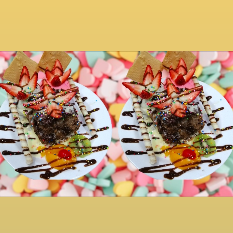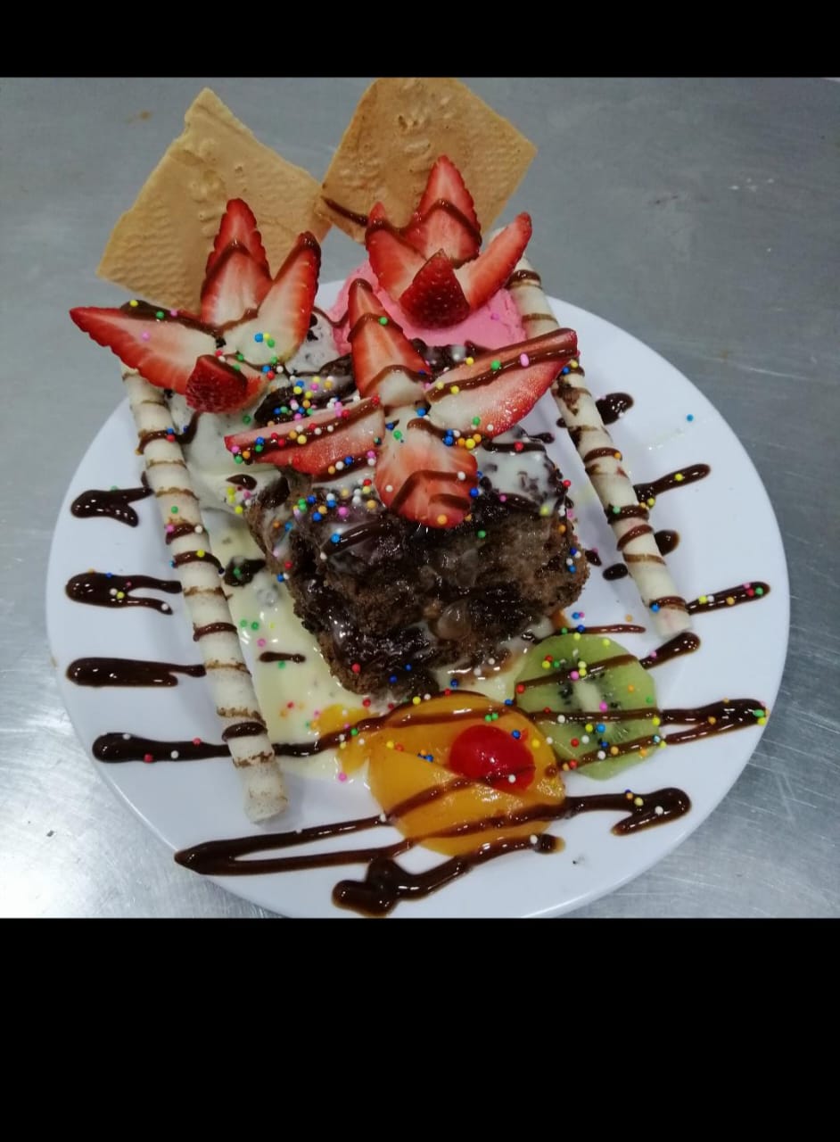 4Porciones de Helado, 2mitades de Brownie, 1 Platillo de helado, Gelatinas,crema, queso, duraznos, Pitaya, Kiwi,higo, manzanas, cerezas, fresas, Para 4 o 5 personas, 1700g