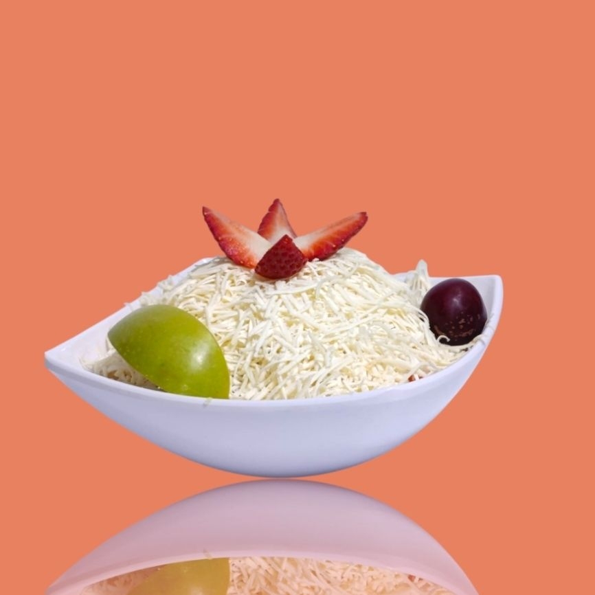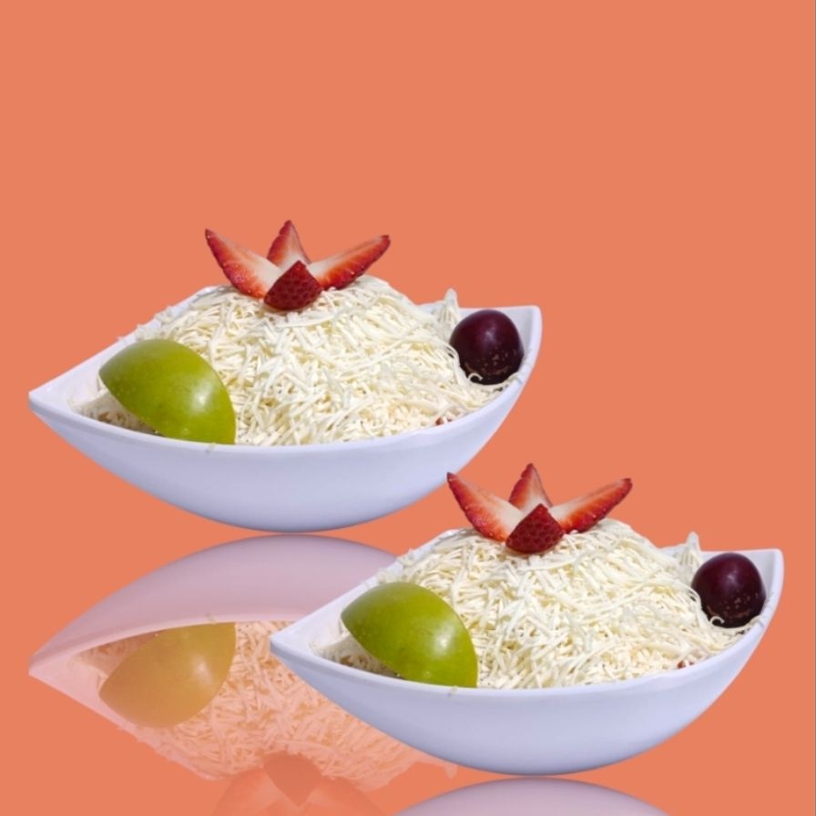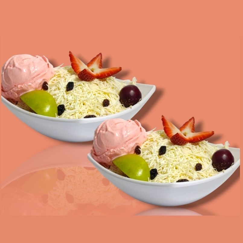 2 ensaladas de frutas 600 gramos cada una, 1 porción de helado, fresa, uvas pasas, ciruela, manzana, crema, queso.