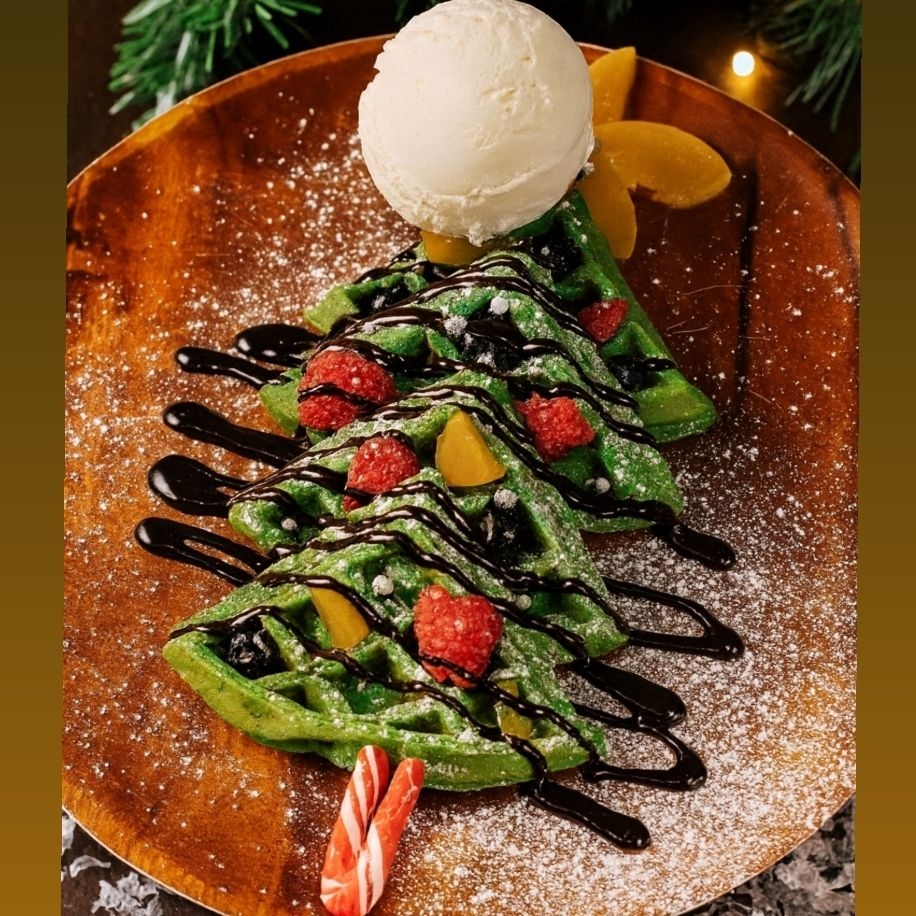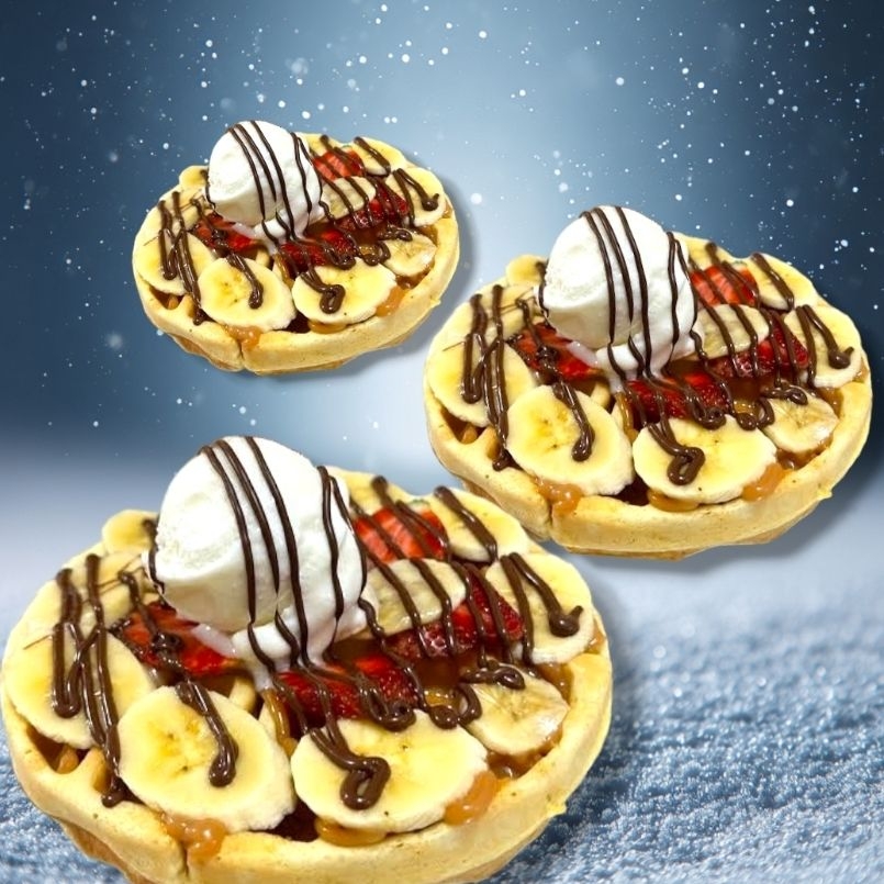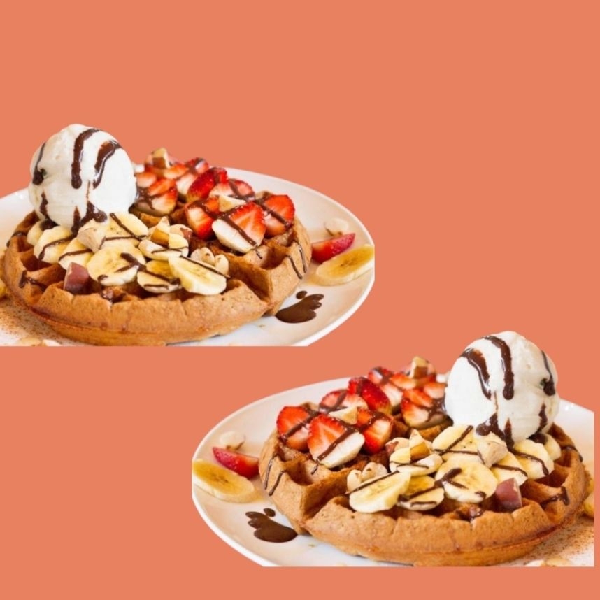 Crepa de waffles, banano, fresa o kiwi. helado, cerezas, salsas de Mora o Chocolate ,crema. Para una persona