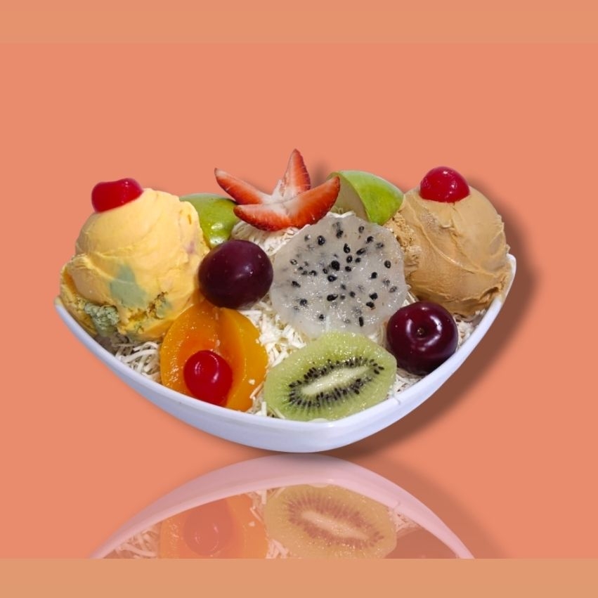 Durazno, kiwi, manzanas, higo, fresa, cerezas,uvas,pitaya,crema,queso, galleta, 1/2 platillo de helado o bola de helado