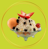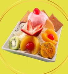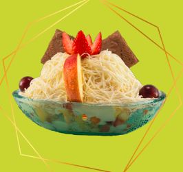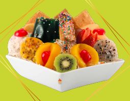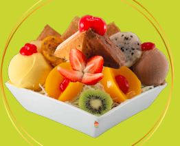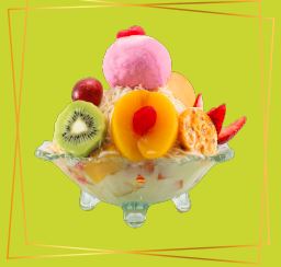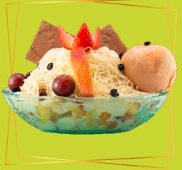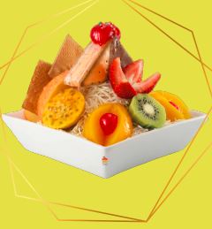 frutas finamente picadas bañada en crema de leche, queso rallado 2 porciones de helado 1/2 platillo, 2 porciones de duraznos, 2 galletas, gelatina, cerezas, kiwi , higo y pitaya.