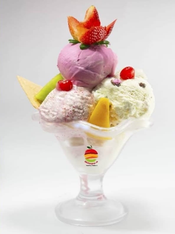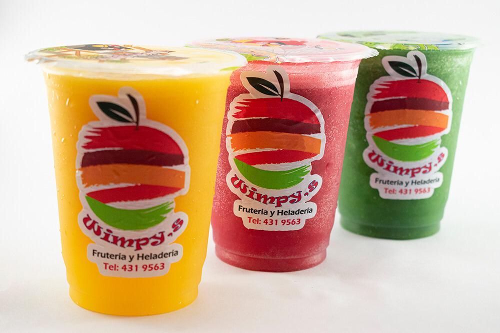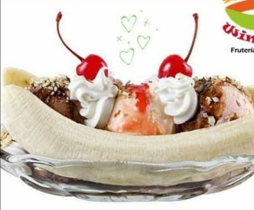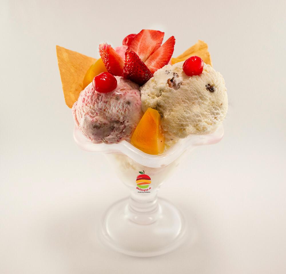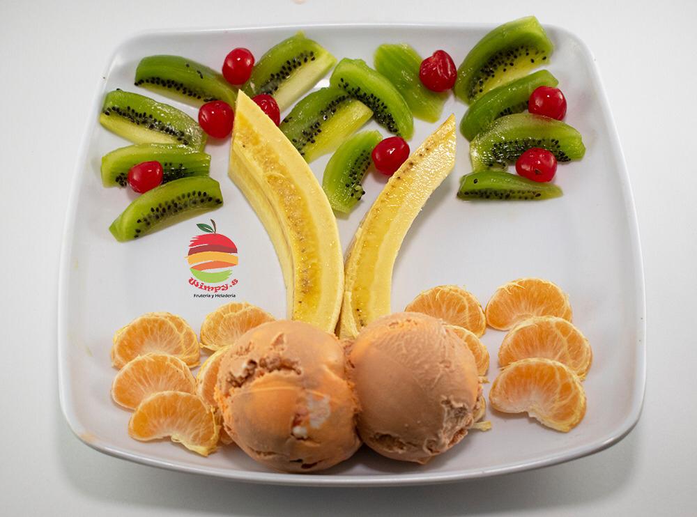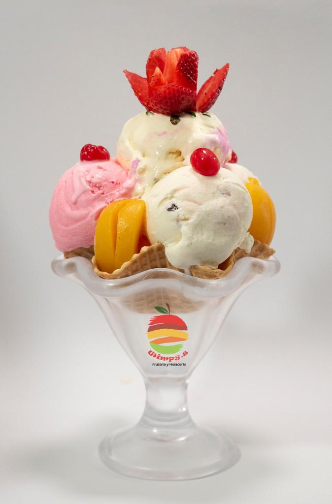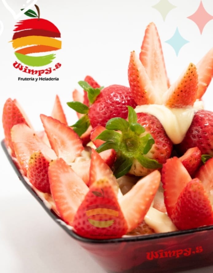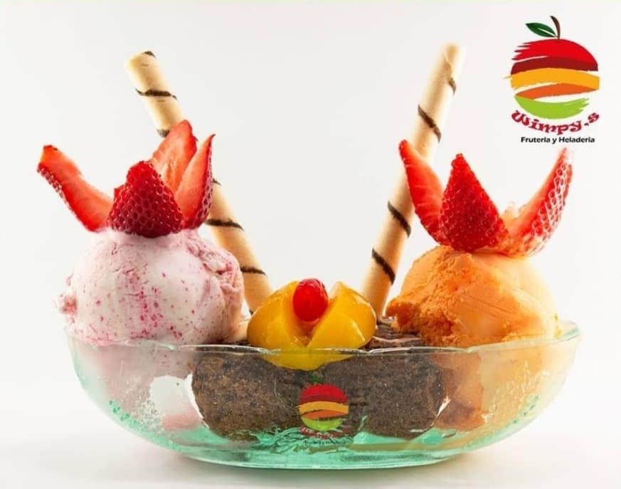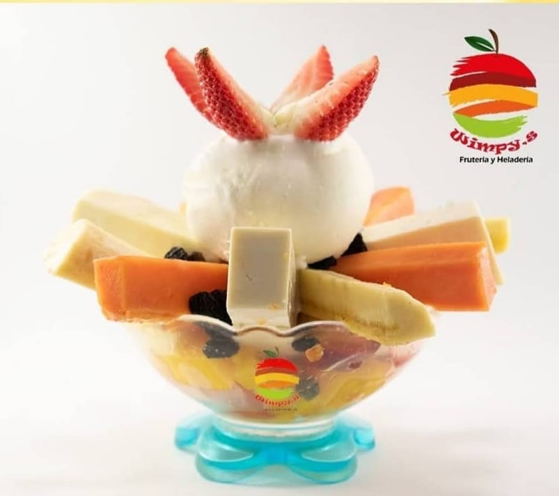 Wimpys: frutas finamente picadas bañada en crema de leche, queso rallado 2 porciones de helado 1/2 platillo, 2 porciones de duraznos, 2 galletas, cerezas, kiwi , higo y pitaya + Guanabana en leche