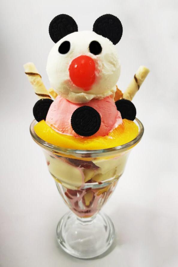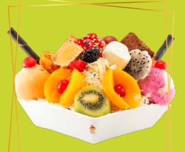 frutas finamente picadas bañada en crema de leche, queso rallado 2 porciones de helado 1/2 platillo, 2 porciones de duraznos, 2 galletas, cerezas, kiwi , higo y pitaya, gelatina, masmelos y barquillo
