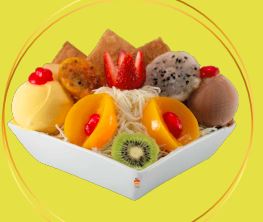 frutas finamente picadas bañada en crema de leche, queso rallado 2 porciones de helado 1/2 platillo, 2 porciones de duraznos, 2 galletas, cerezas, kiwi , higo y pitaya.