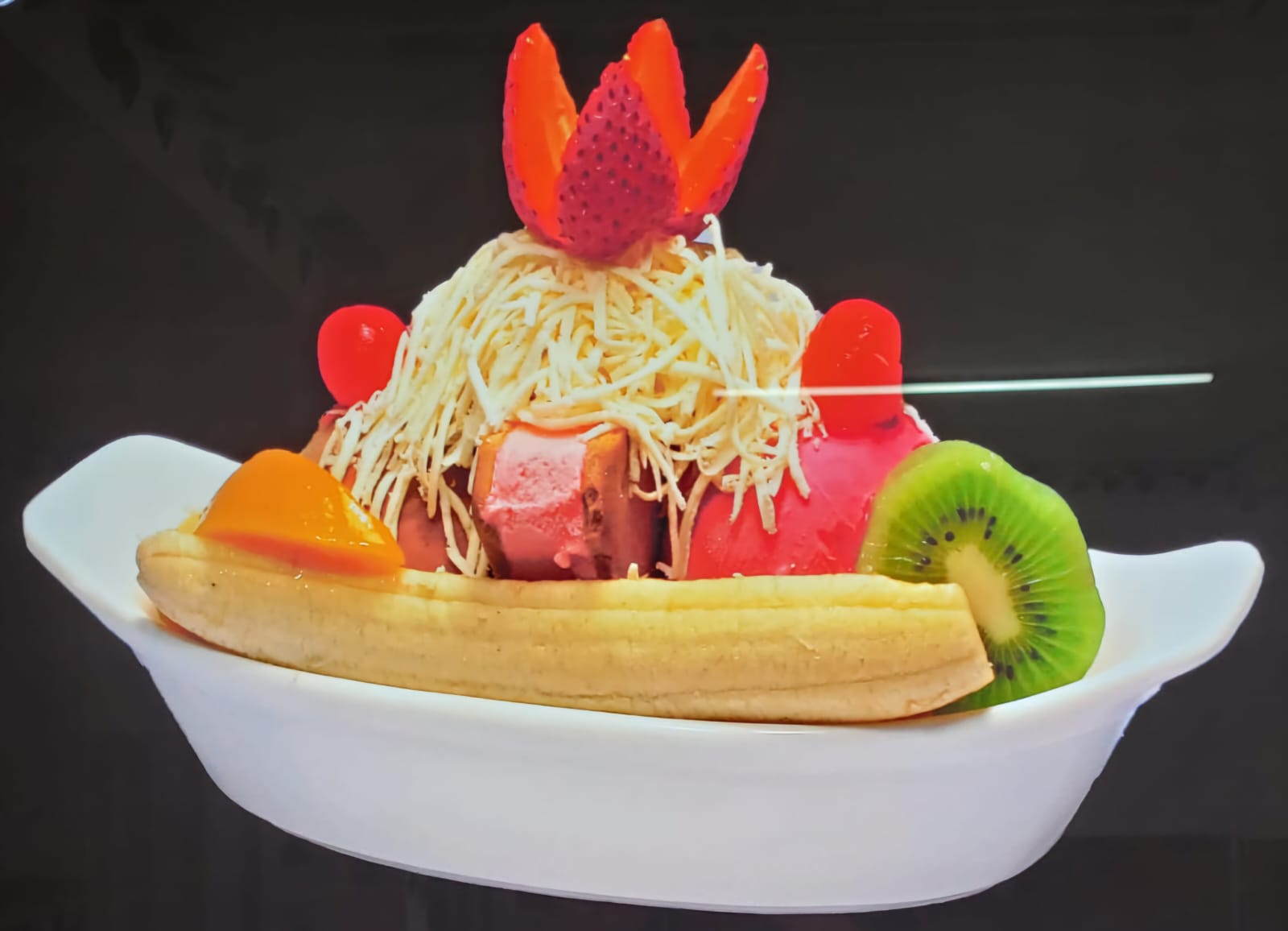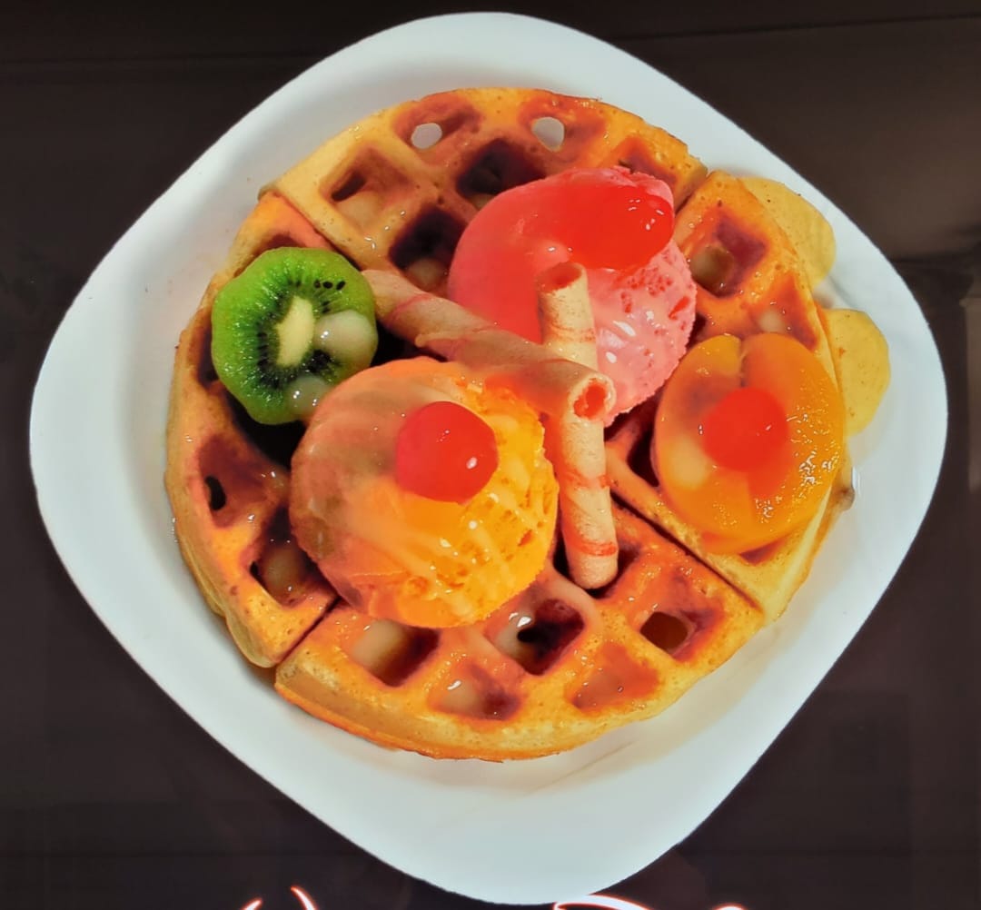 Waffle 2 bolas de helado kiwi durazno cerezas barquillos