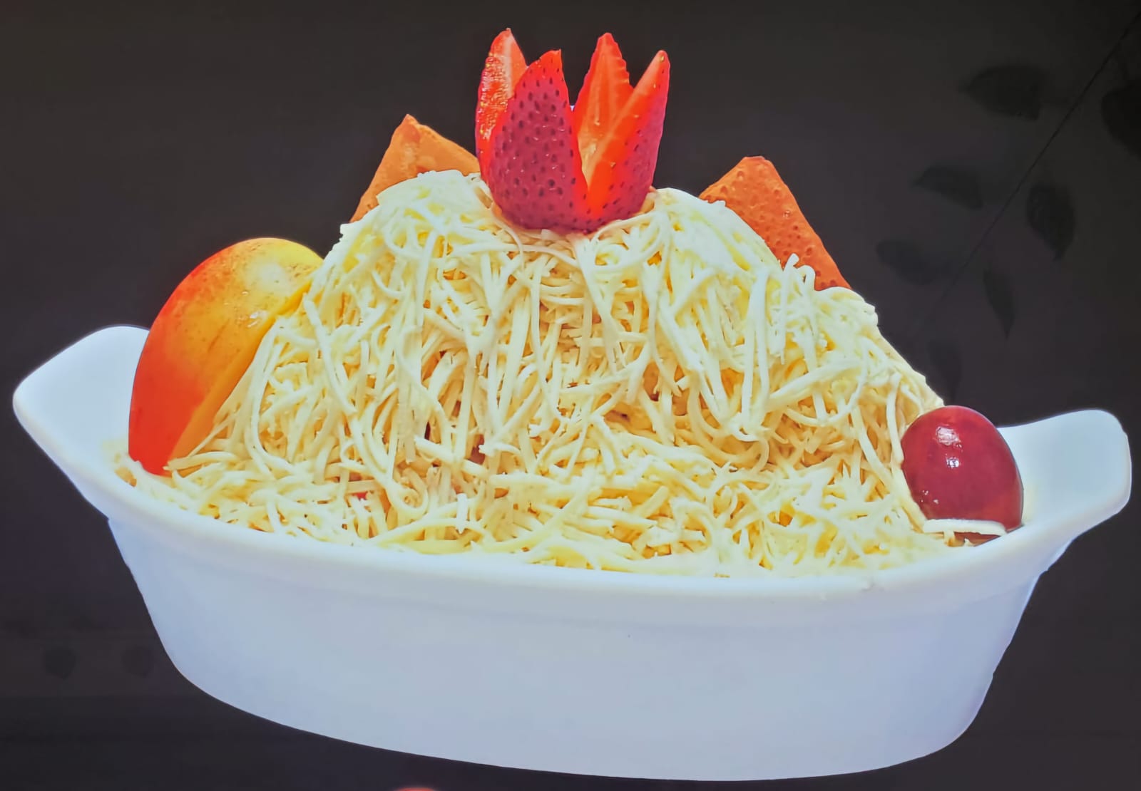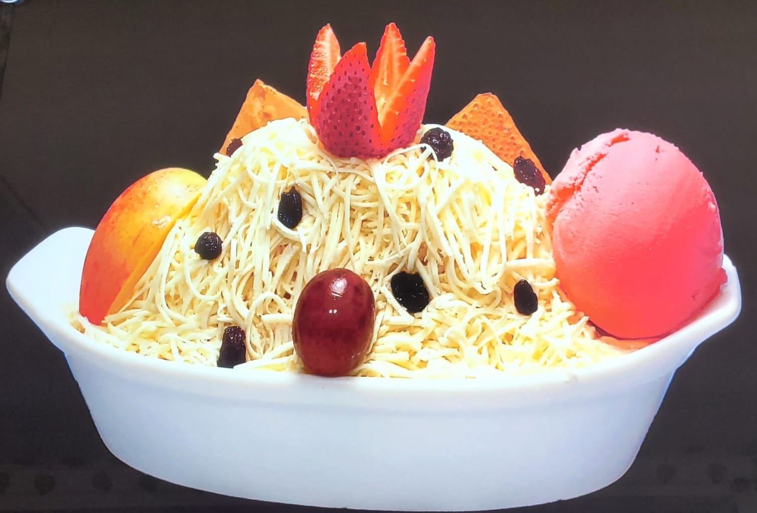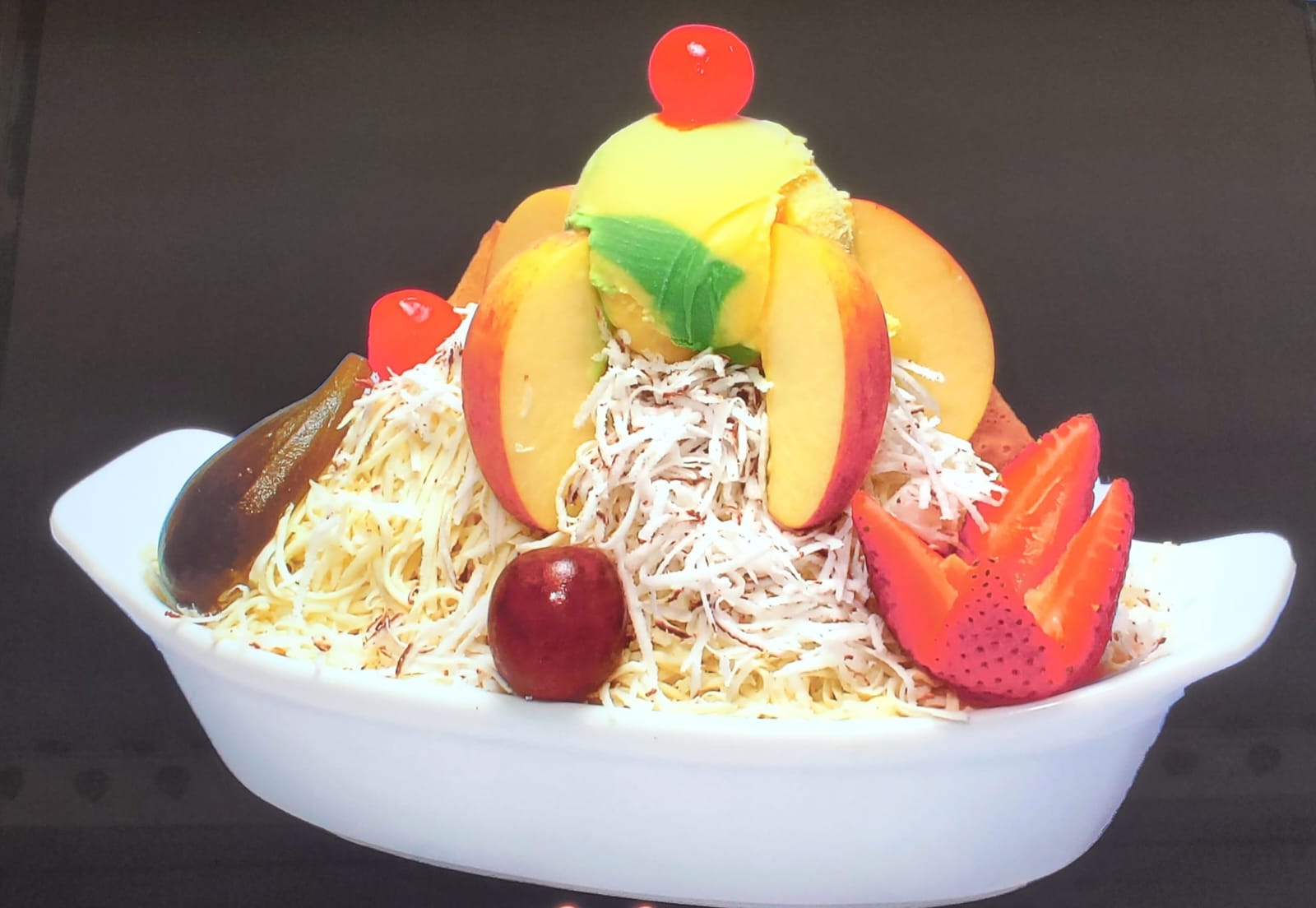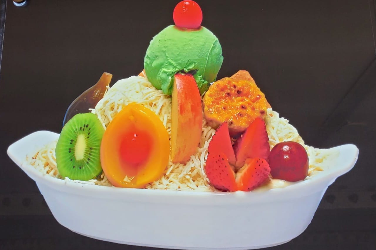 Papaya, banano, manzana, piña, mango, fresa, crema de leche, queso, kiwi, durazno, pitaya, uva, cereza, 1 bola de helado, melocotón y medio platillo de helado.