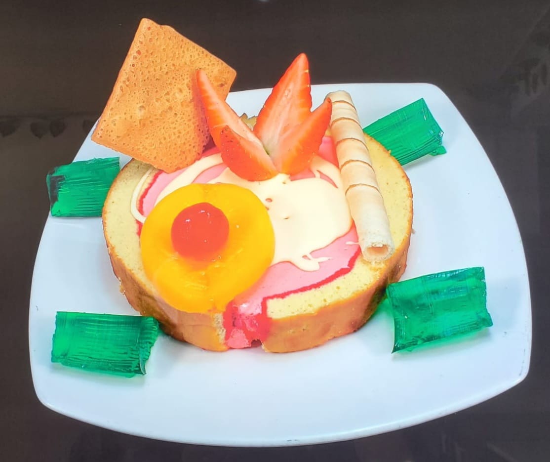 Rollo de helado gelatina crema de leche durazno fresa cereza galletas barquillo