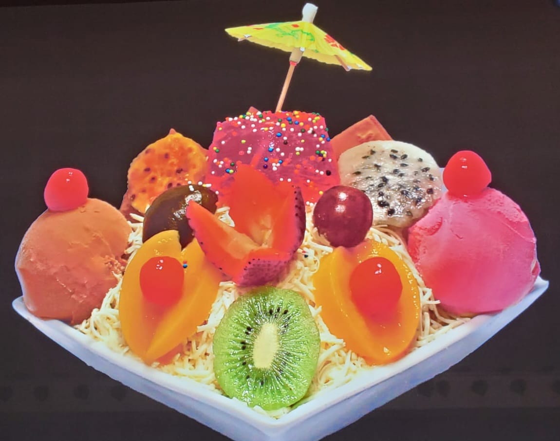 Ensalada personal, Fruta picada, crema de leche, queso, 2 bolas de helado, 2 duraznos, Kiwi, pitaya, higo, breva, cerezas, barquillos, media galleta de helado