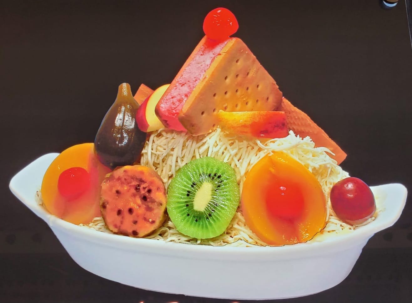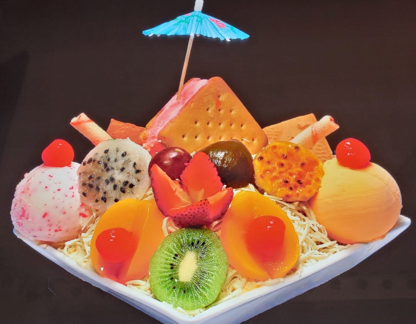 Fruta picada crema de leche queso 2 bolas de helado gelatina 2 durazno kiwi higo pitaya breva cerezas galletas