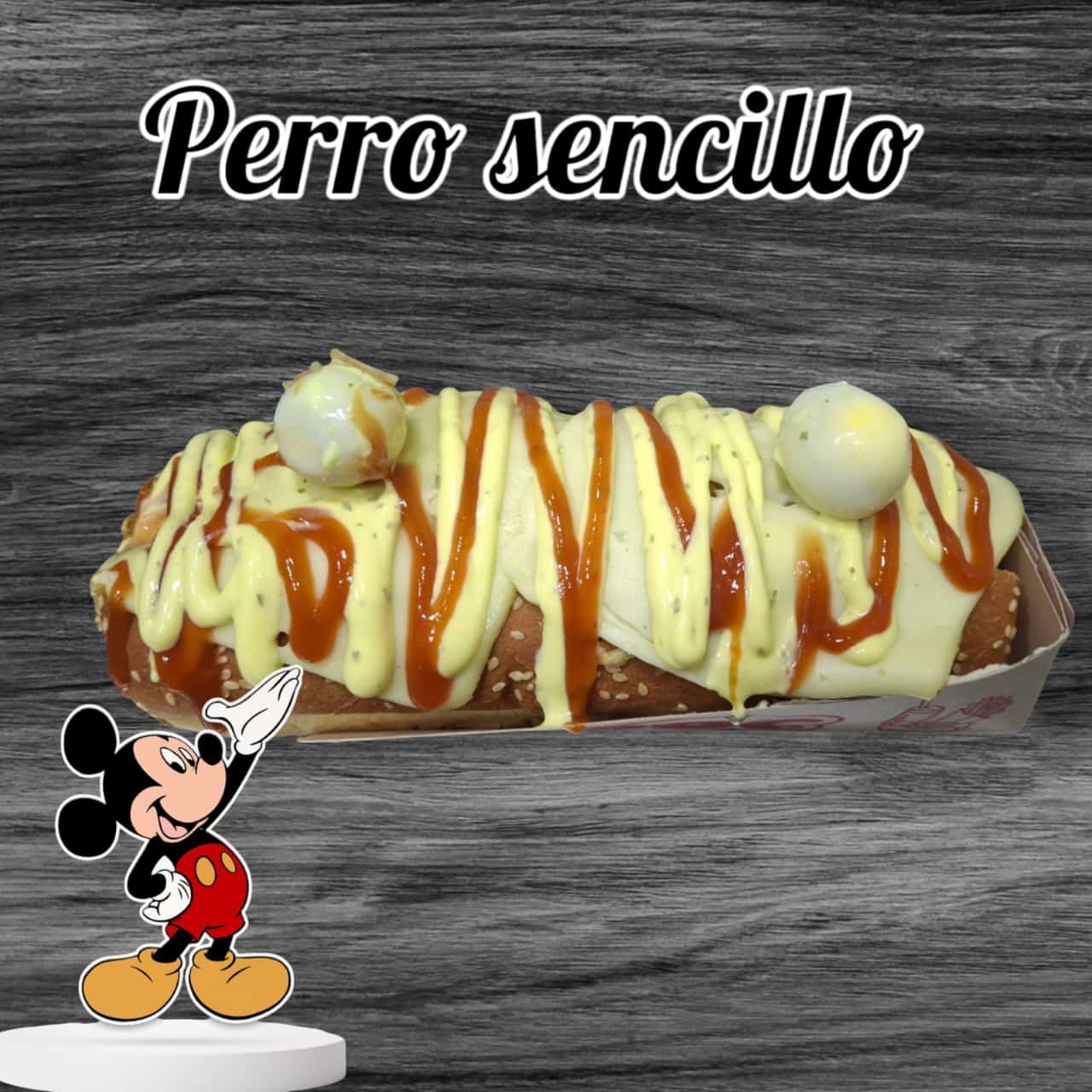 Pan bimbo, Salchicha americana, cebolla, carne desmechada, maíz, cabello de angel, queso, 3 huevos de Codorniz, salsas.