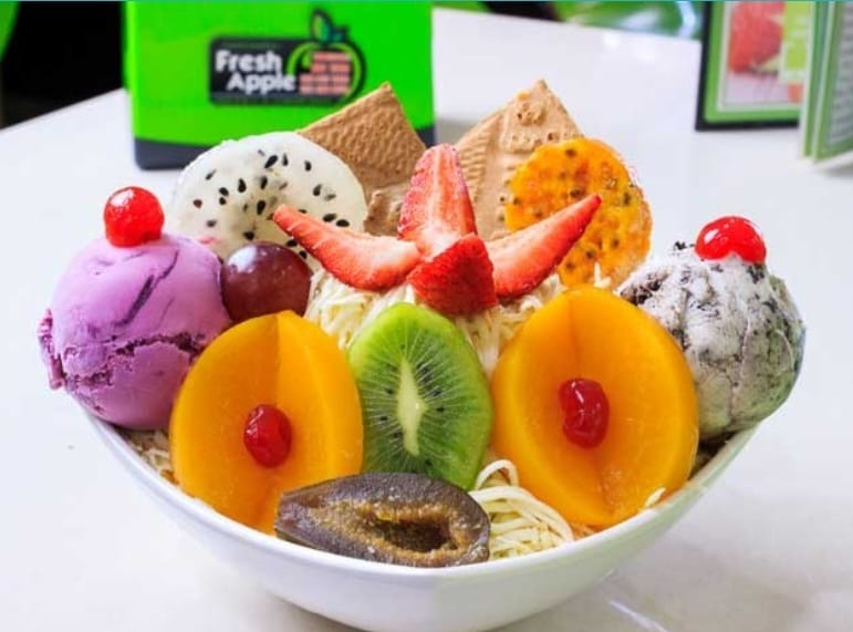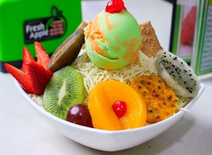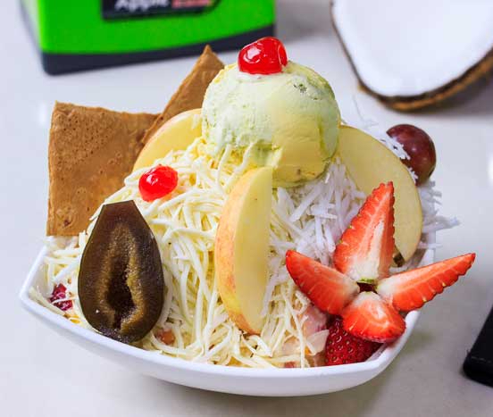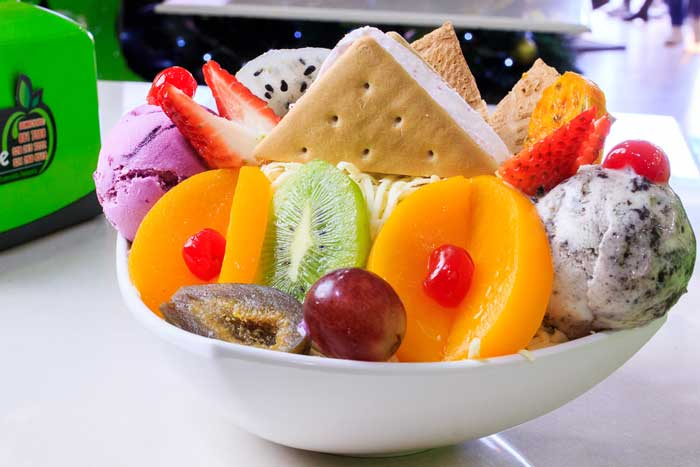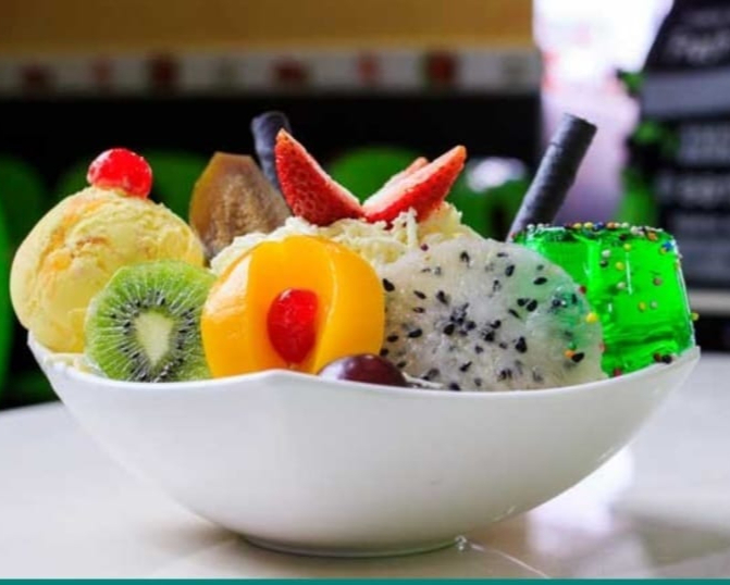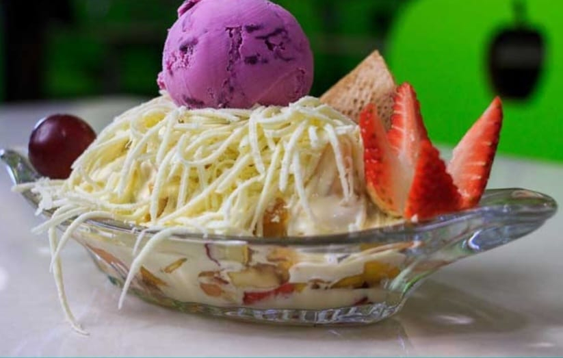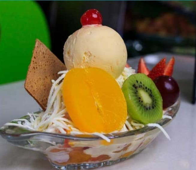 Mix de frutas (papaya, banano, mango, manzana, pera, durazno, cereza, kiwi), queso, crema de leche y 2 sabores de helado; coronado con fresa, uva y galleta con helado.