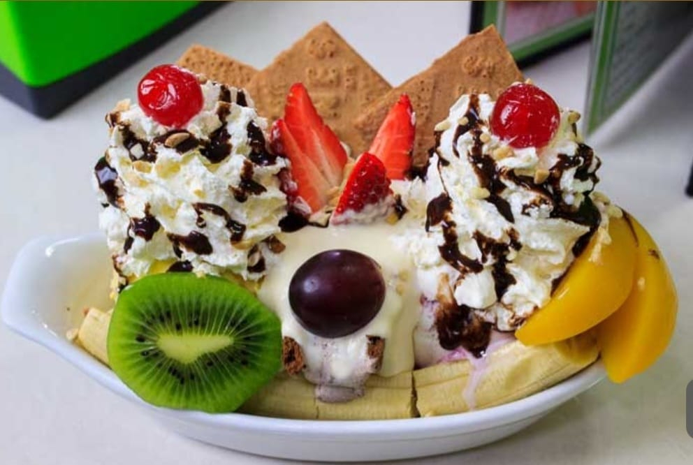 Banano, crema de leche, kiwi, uva, fresa, coronada con 3 bolas de helado, crema chantilly, grageas y galletas.