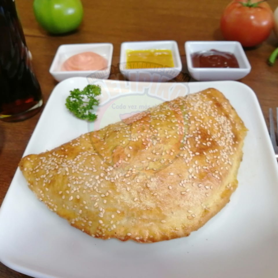 Relleno de carne boloñesa, pollo, queso, champiñón, salami, jamón y pepperoni.