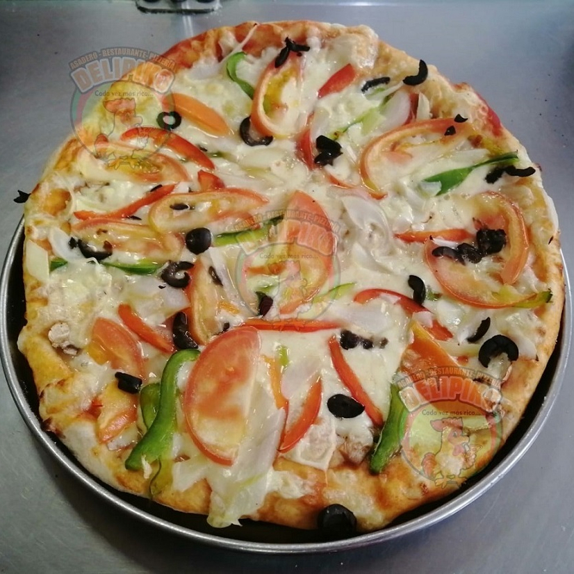 Pizza artesanal con salsa pomodoro de la casa, cebolla, pimentones, queso, tocineta y costillitas bañadas en BBQ, 40 cm 8 porciones.
