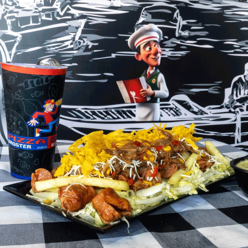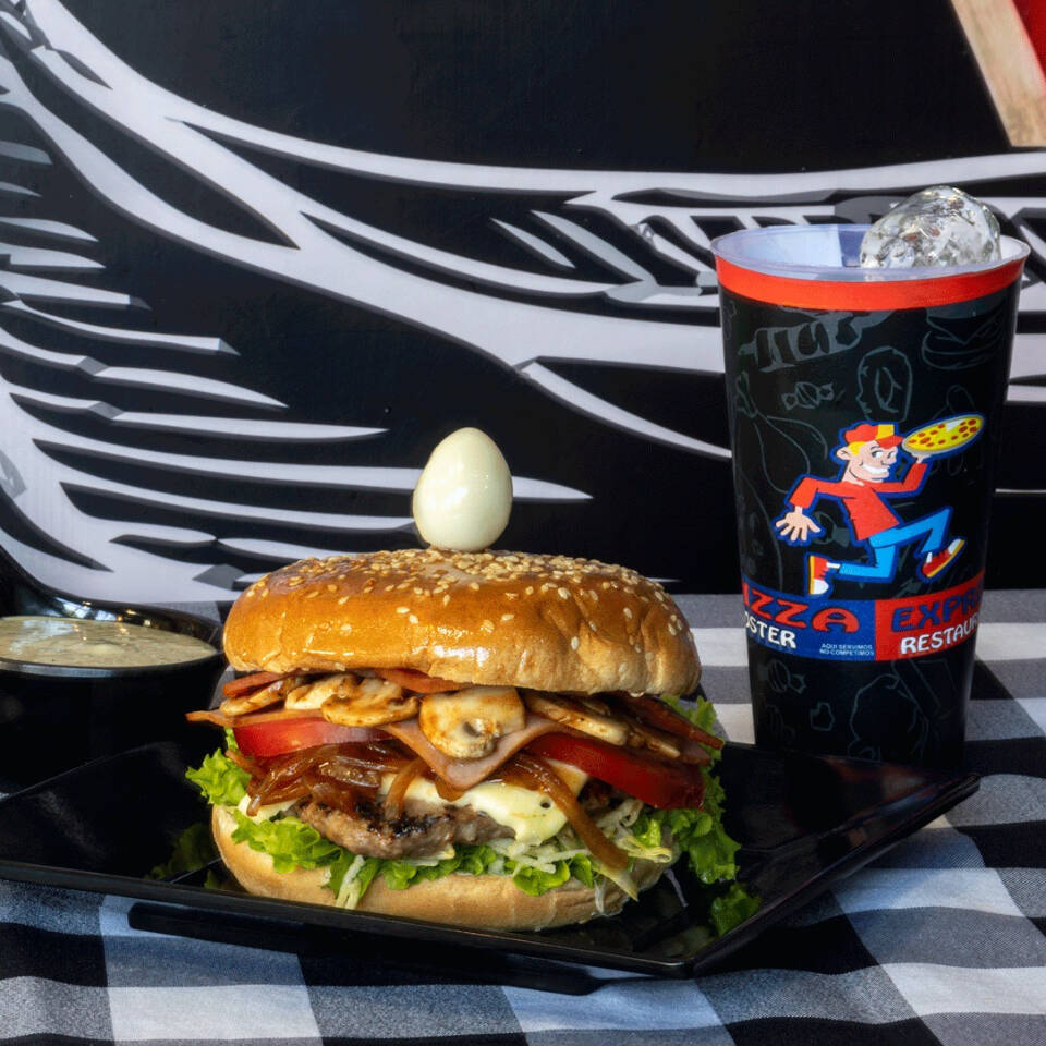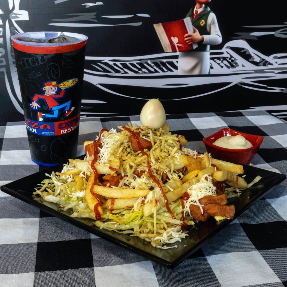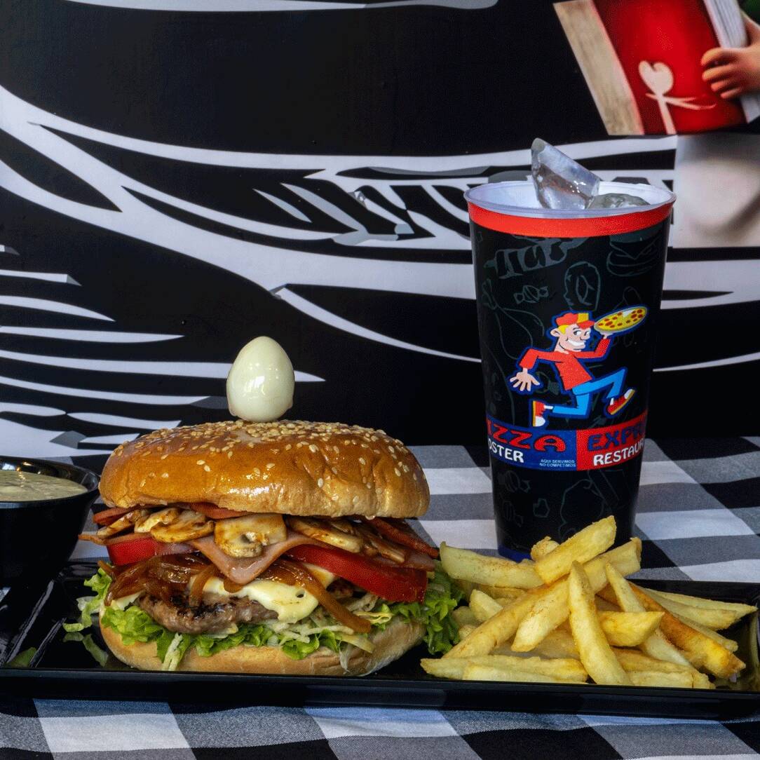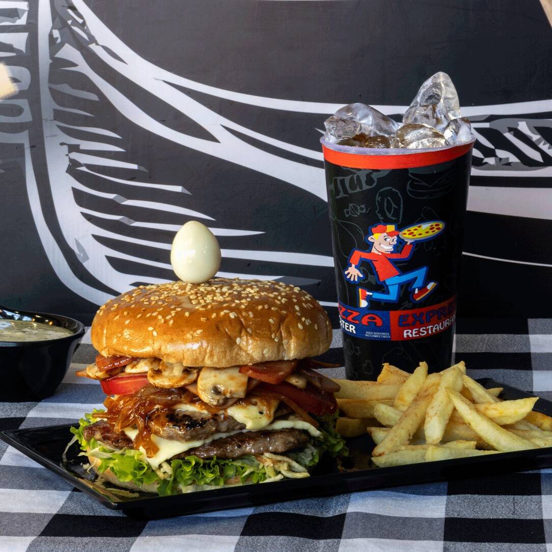 Carne, queso, cebolla, tomate, lechuga, jamón, champiñones, tocineta, pico de gallo, jalapeños, huevo de codorniz, salsas y gaseosa 250 ml.