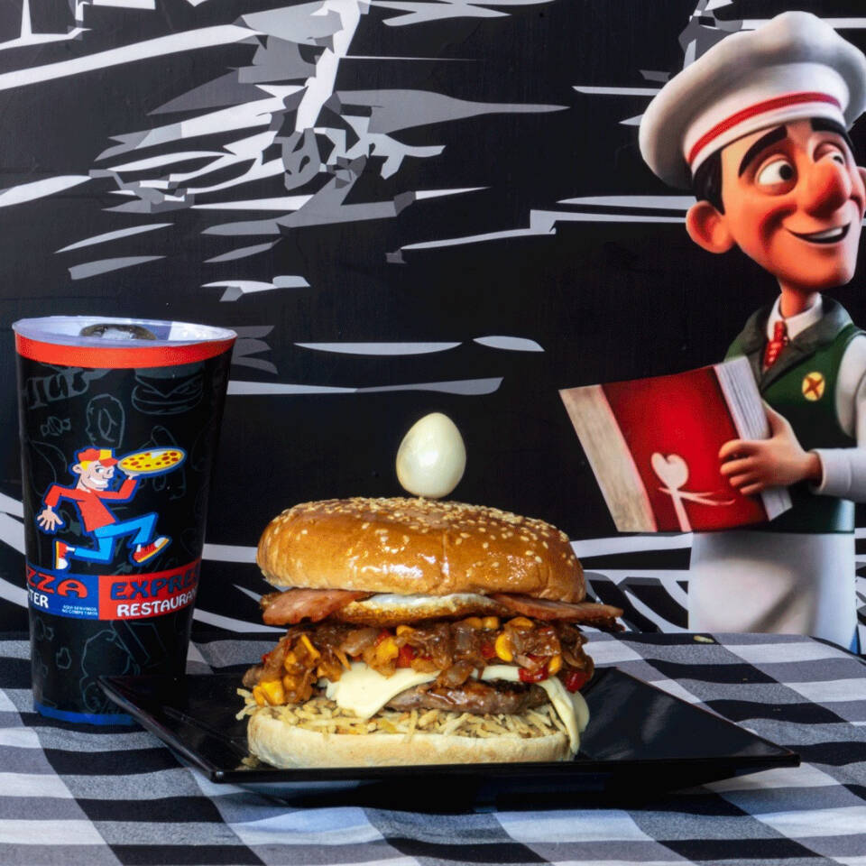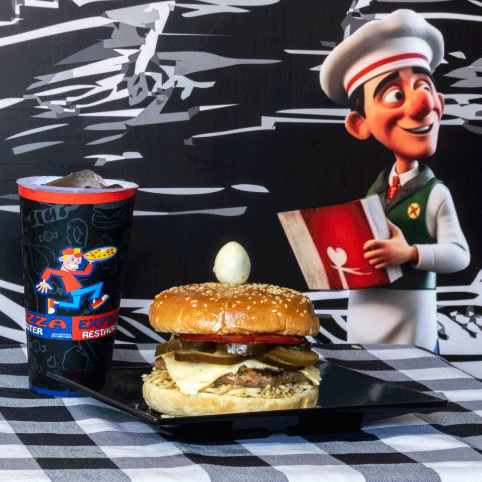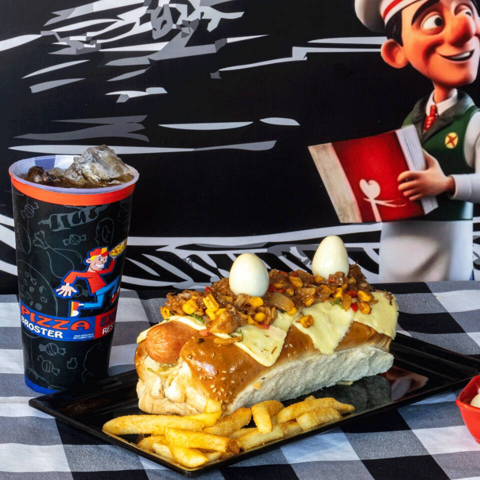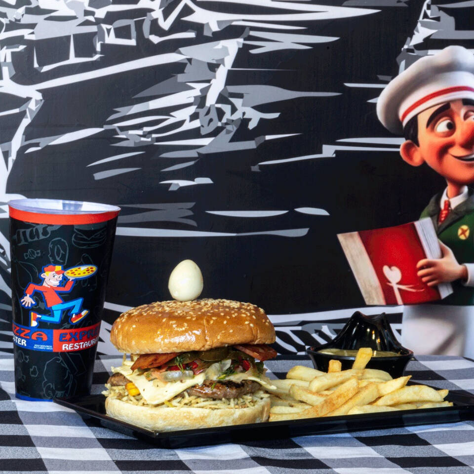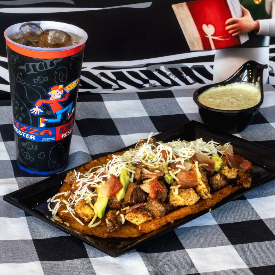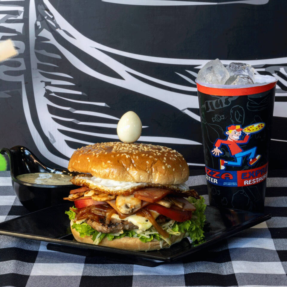 Carne, queso, cebolla, tomate, lechuga, jamón, champiñones, tocineta, pico de gallo, jalapeños, huevo de codorniz, salsas y gaseosa 250 ml.