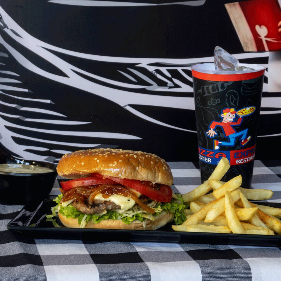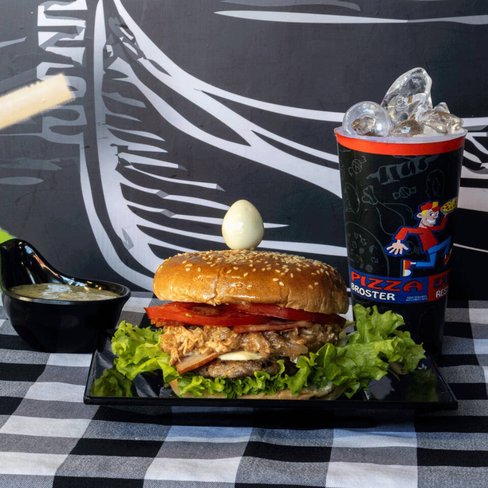 Carne, queso, cebolla, tomate, lechuga, tocineta, huevo de codorniz, salsas, papa francesa y gaseosa 250 ml.