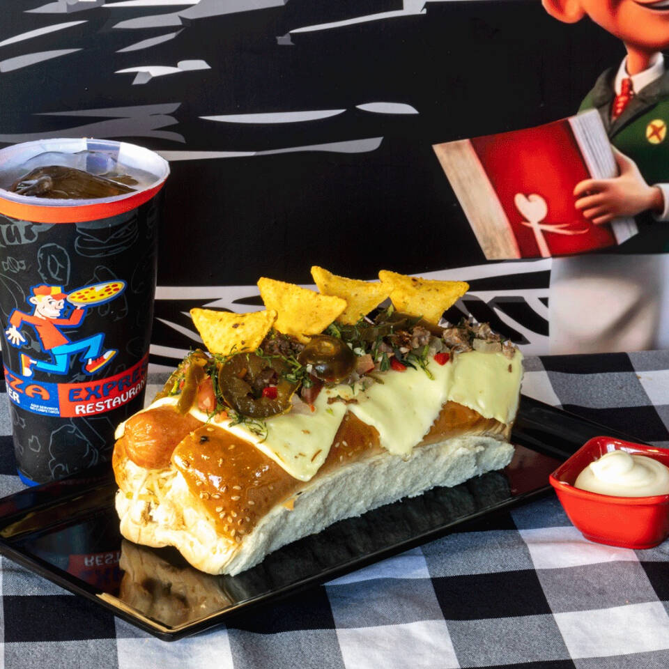 Salchicha americana, carne desmechada, tocineta, jalapeños, queso, pico de gallo, papas chips, huevos de codorniz y salsas.