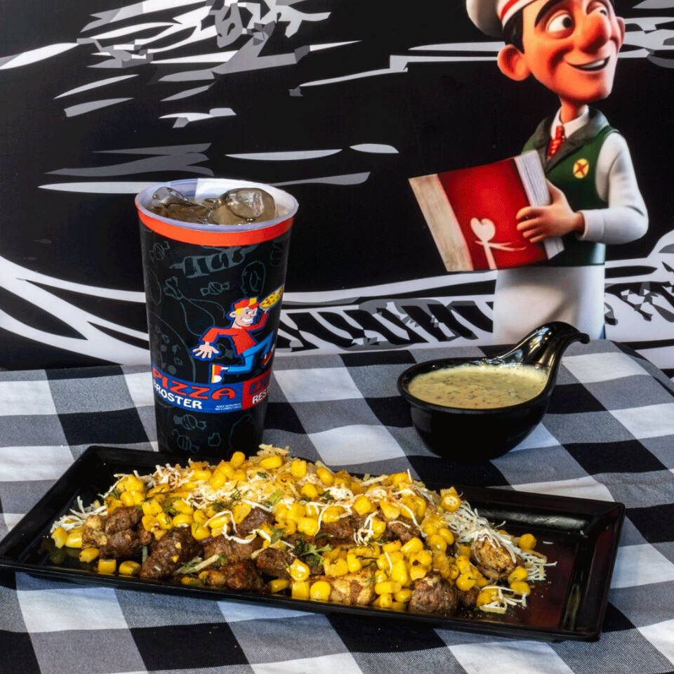 Mazorca tierna, carne jugosa, pollo en cubos, queso, papas chips y salsas.