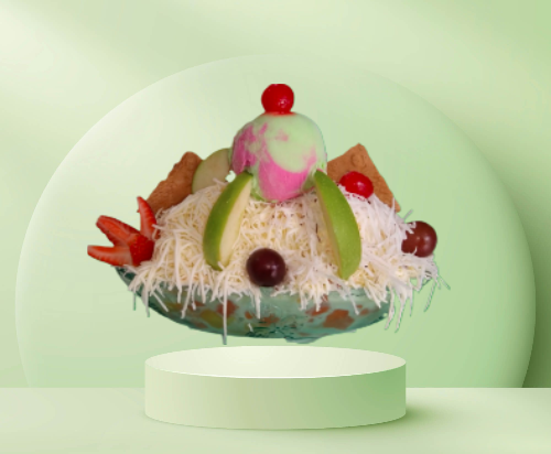Papaya, melón, mango, banano con crema de leche, queso, durazno, fresa, kiwi, manzana, carambolo, acompañado de una porción de helado, fresas y galleta.