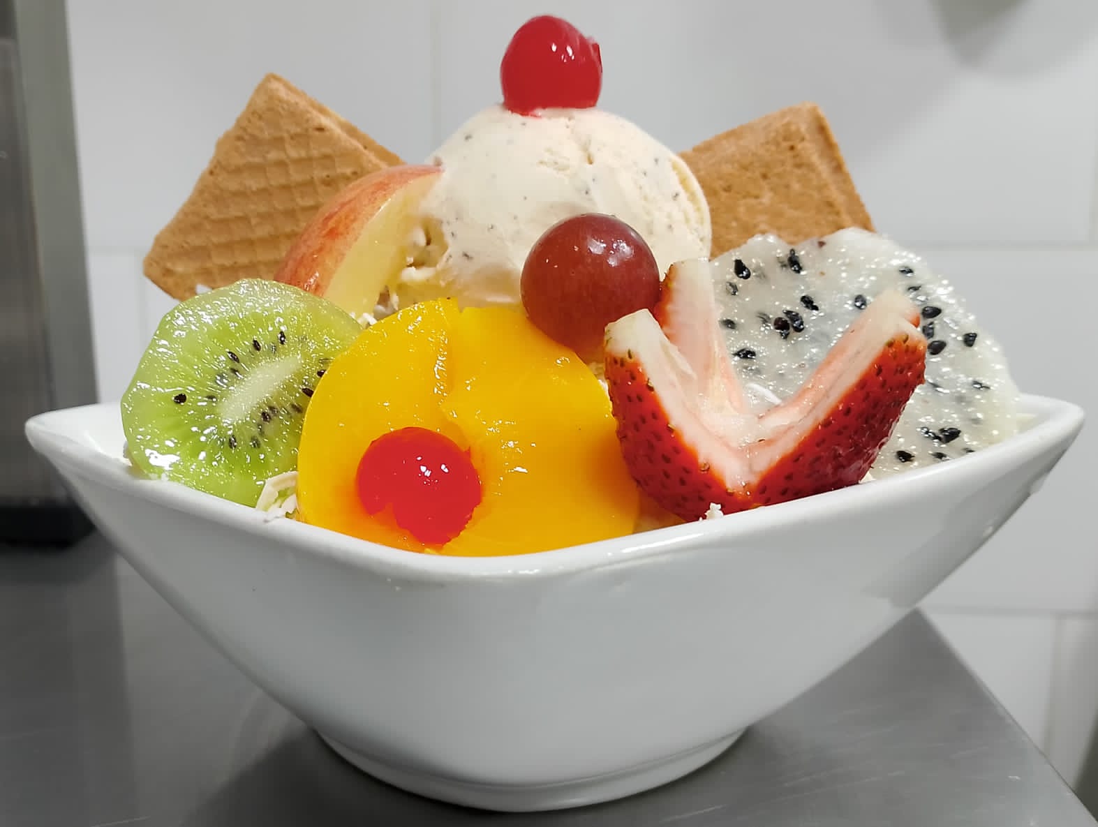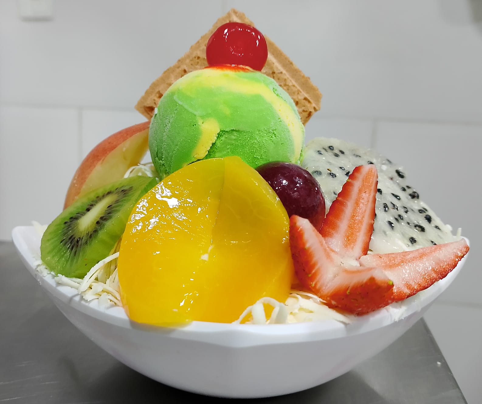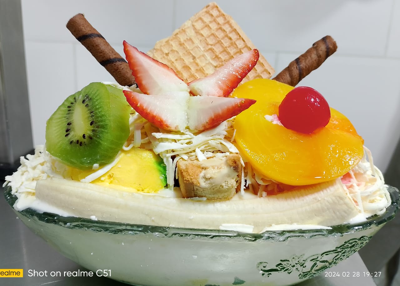 Papaya, banano, manzana, piña, mango, fresa, crema de leche, queso, kiwi, durazno, pitaya, uva, cereza y medio helado de platillo.