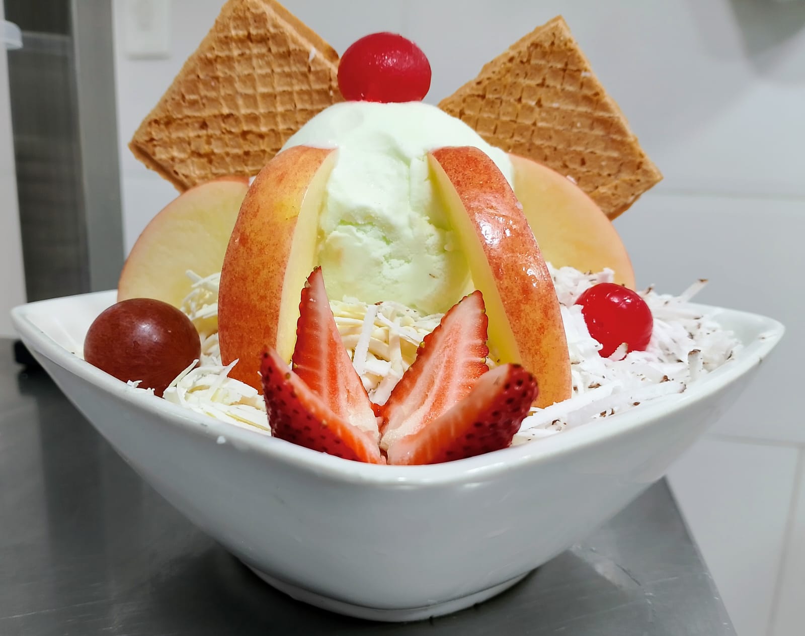 5 Bolas de helado, crema de leche, fresa, kiwi, durazno, cereza, grajea y barquillos.