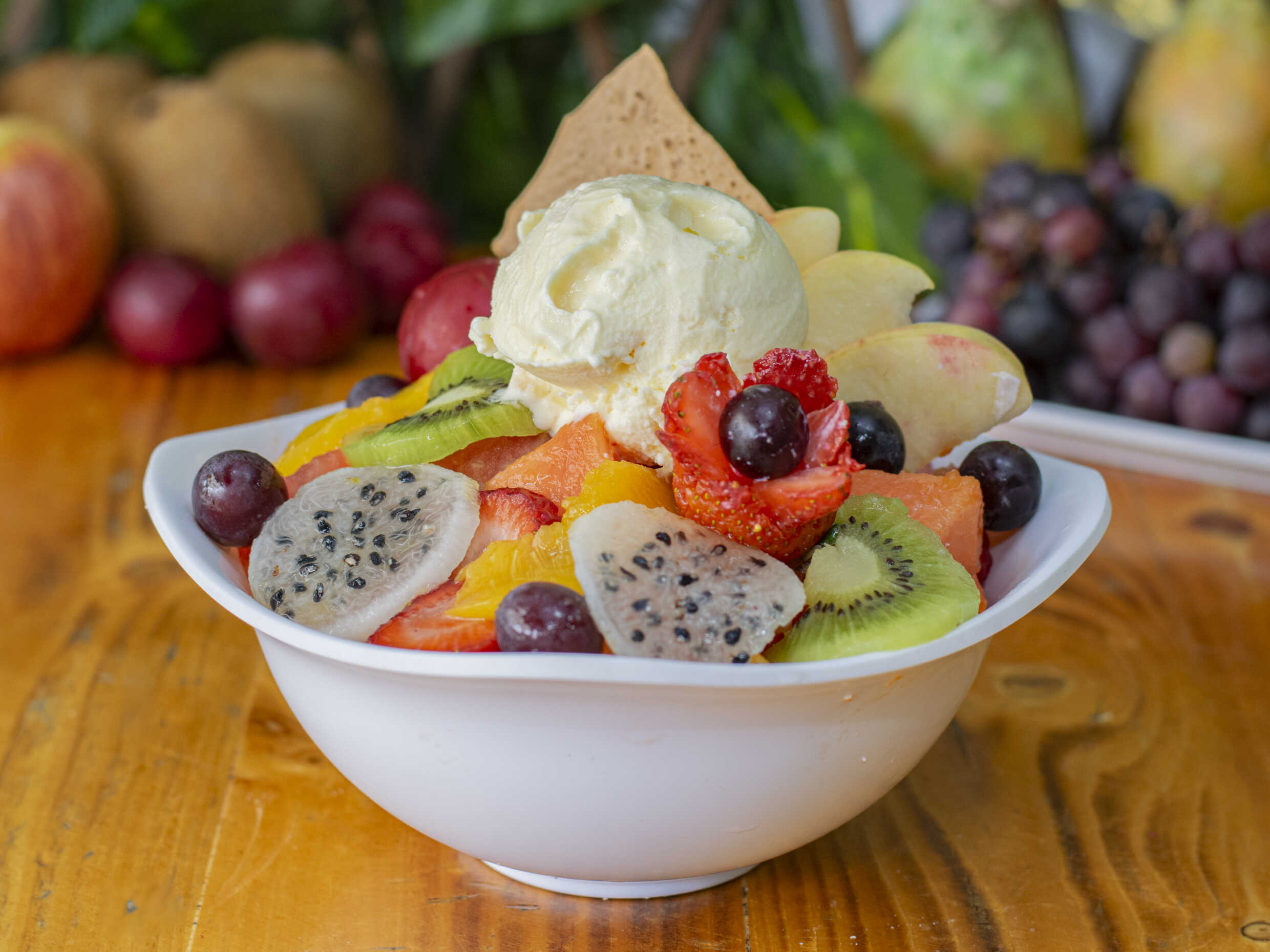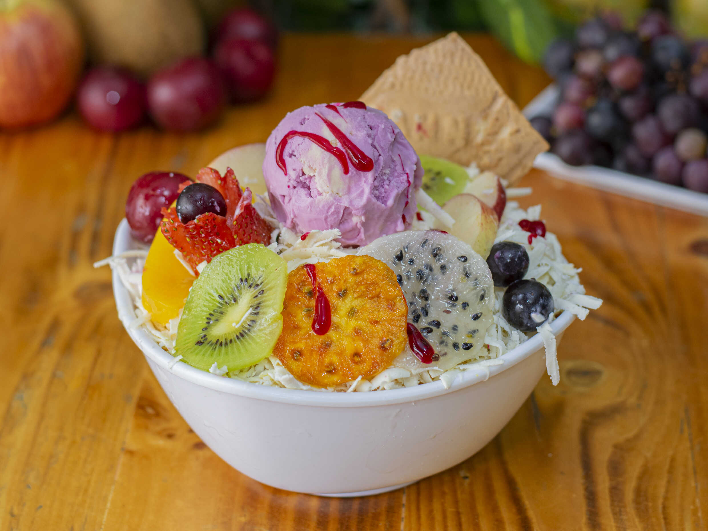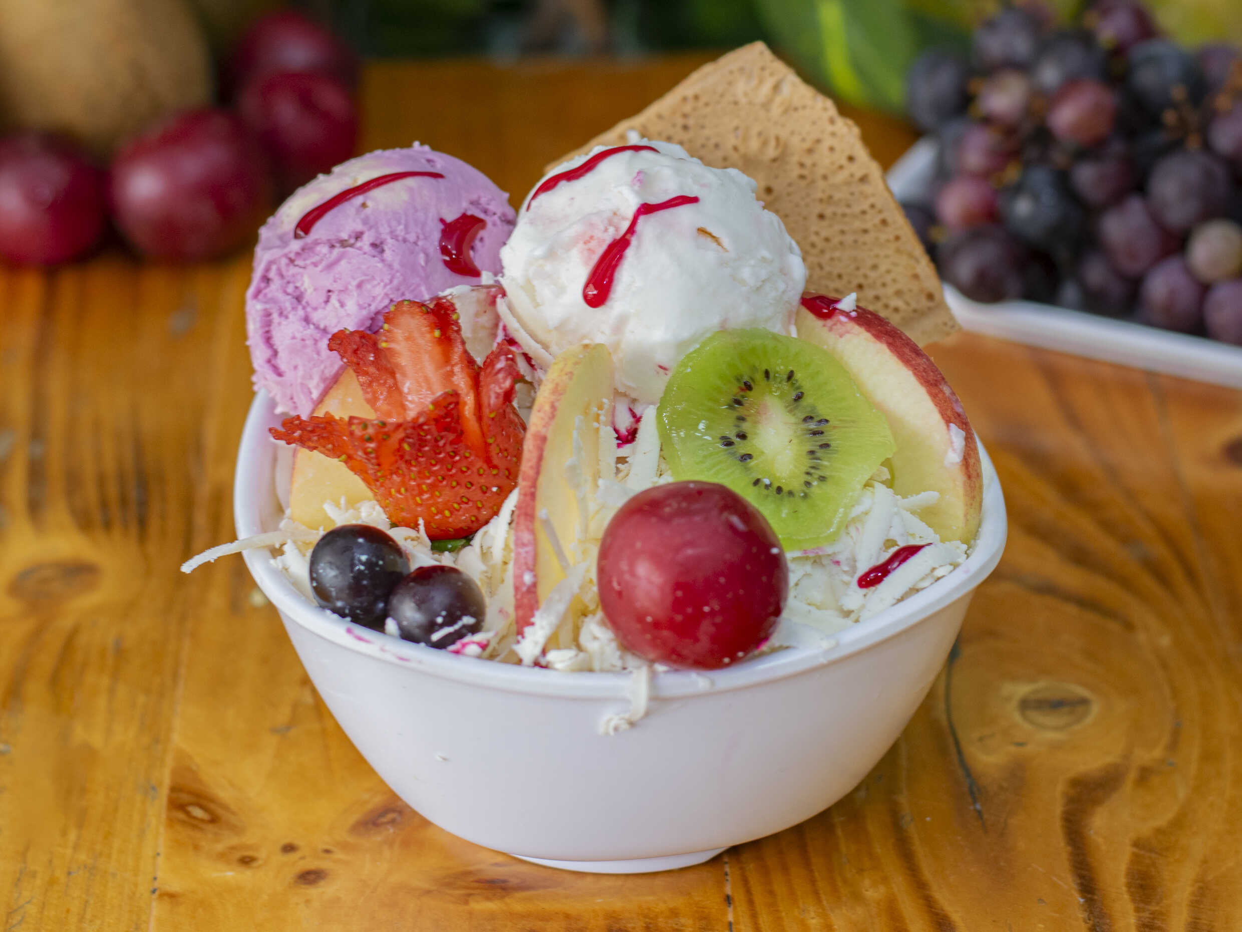 Fruta variada picada, crema de leche, queso rallado, gelatina, barquillo y doble sabor de helado.
