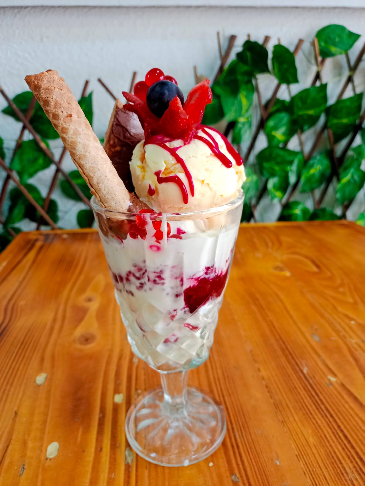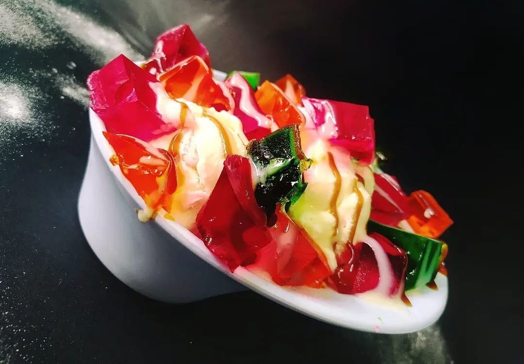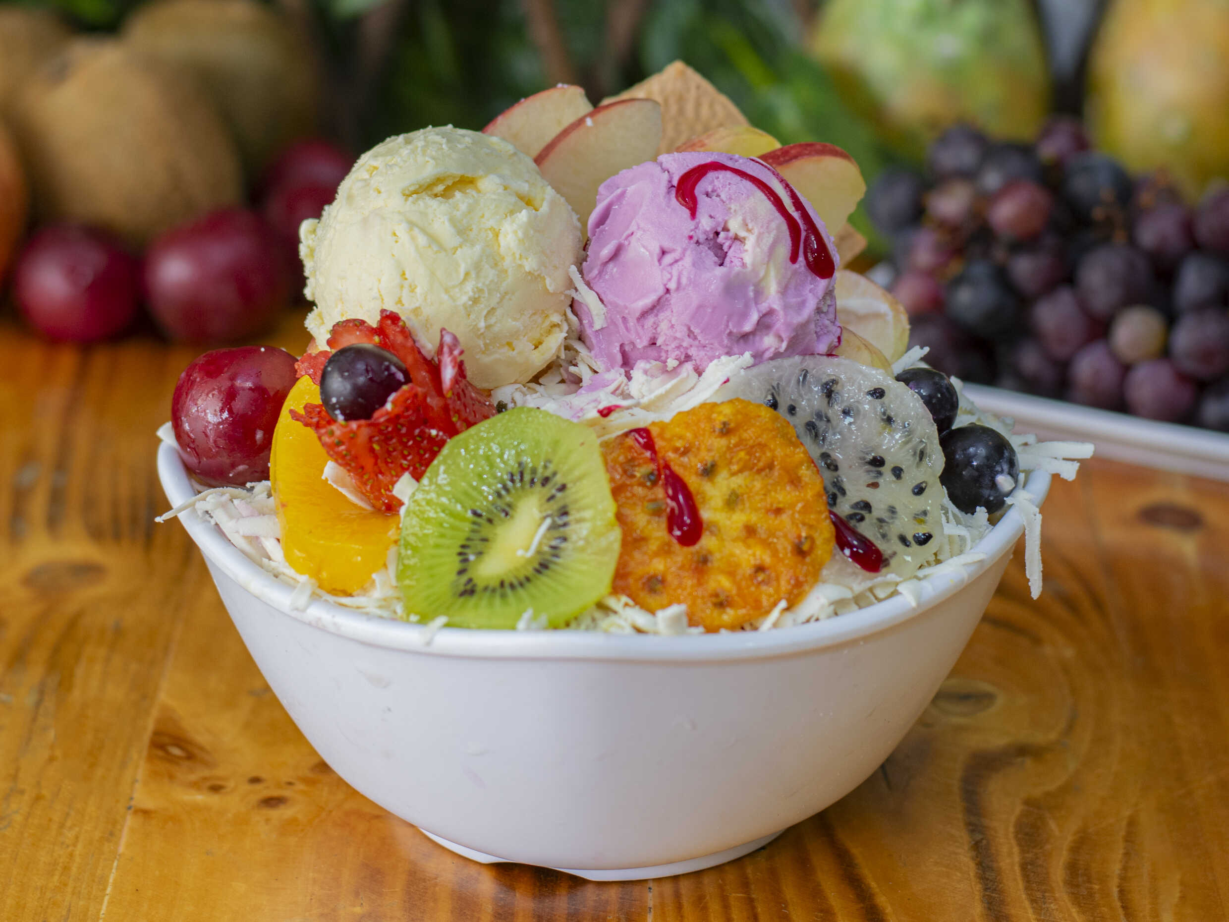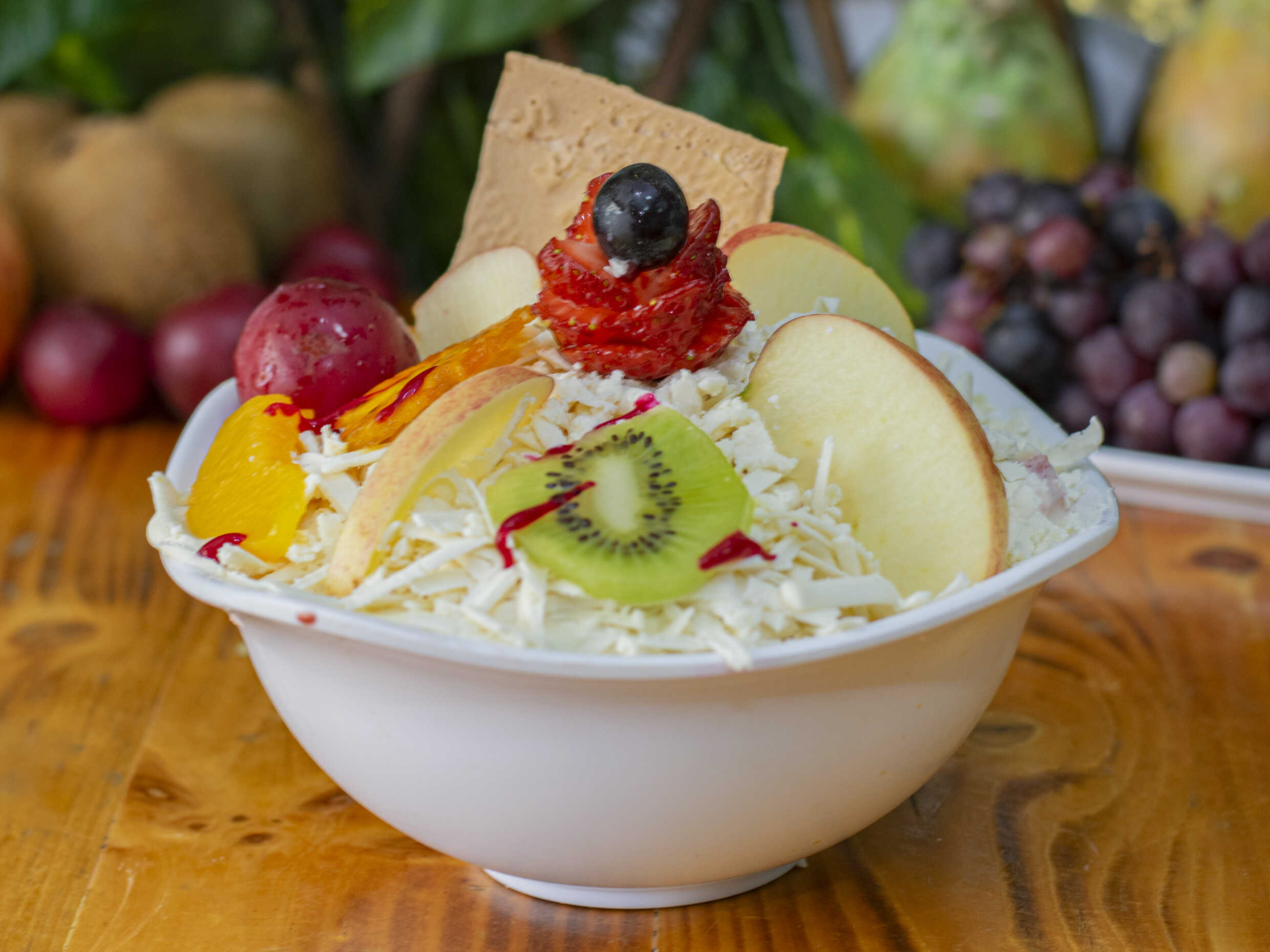 Fruta variada picada, crema de leche, queso rallado, gelatina, barquillo y doble sabor de helado.