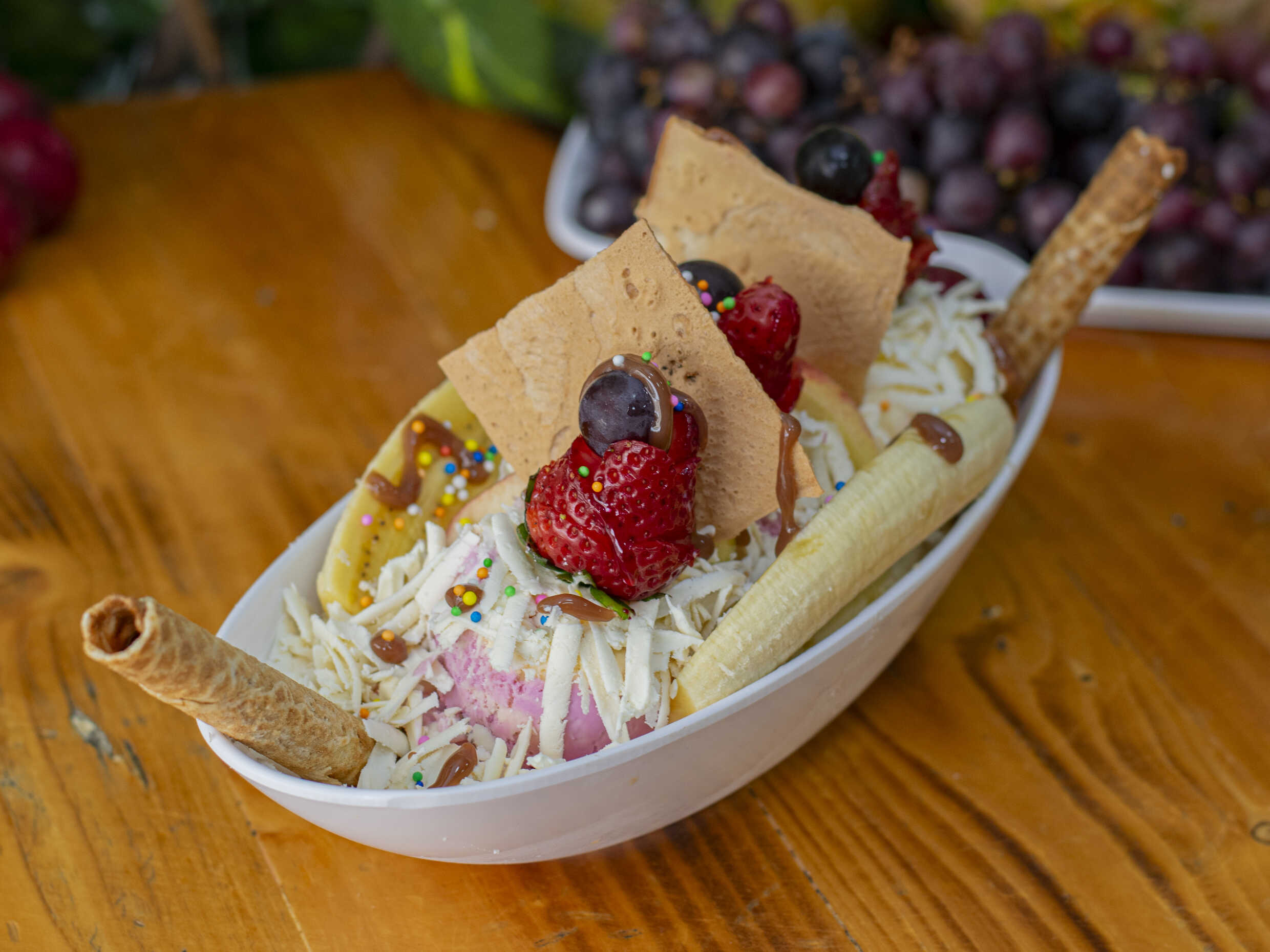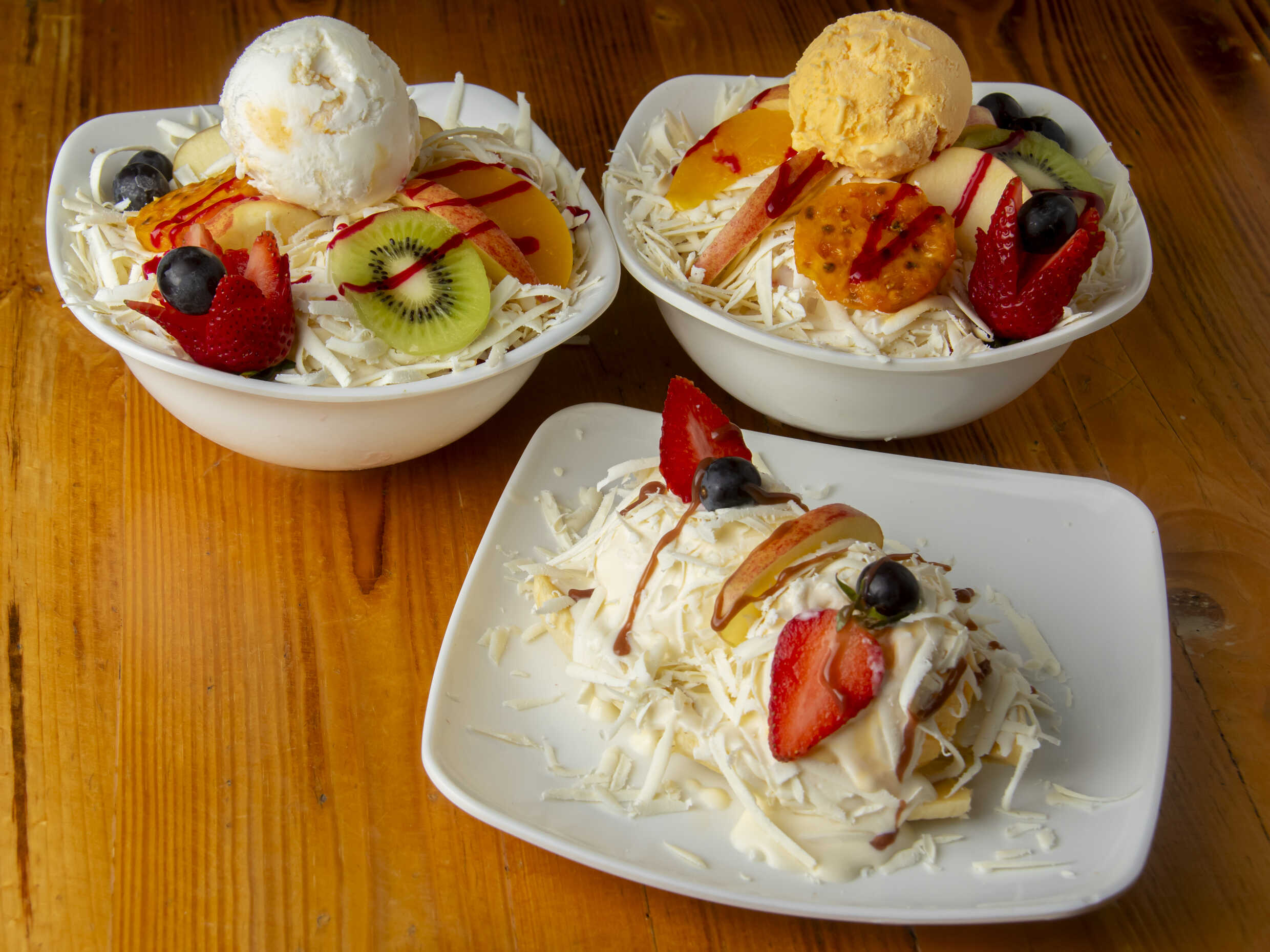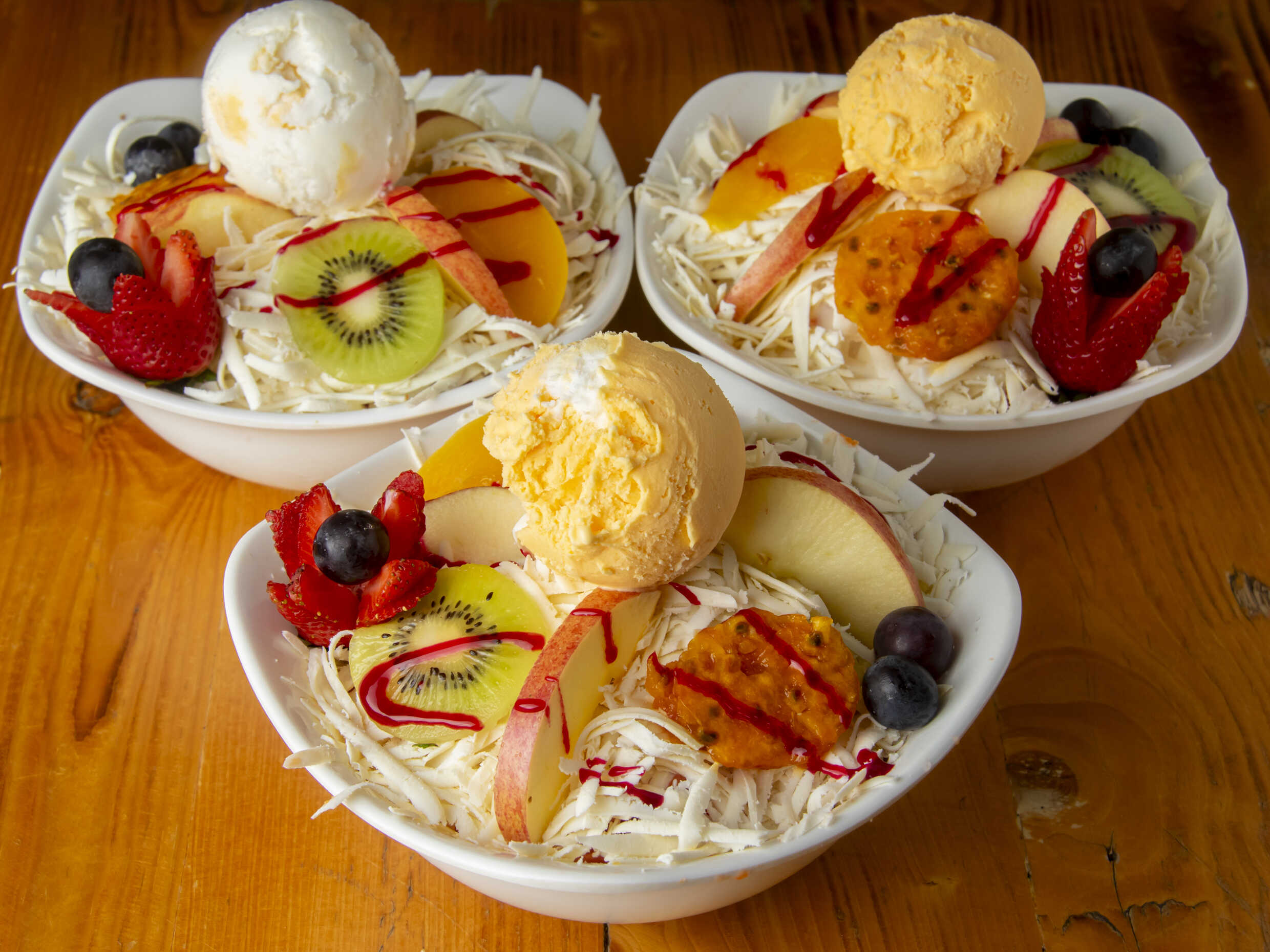 Tres sabores de helado, leche condensada, barquillos, mango, kiwi, fresa, durazno, manzana y uvas