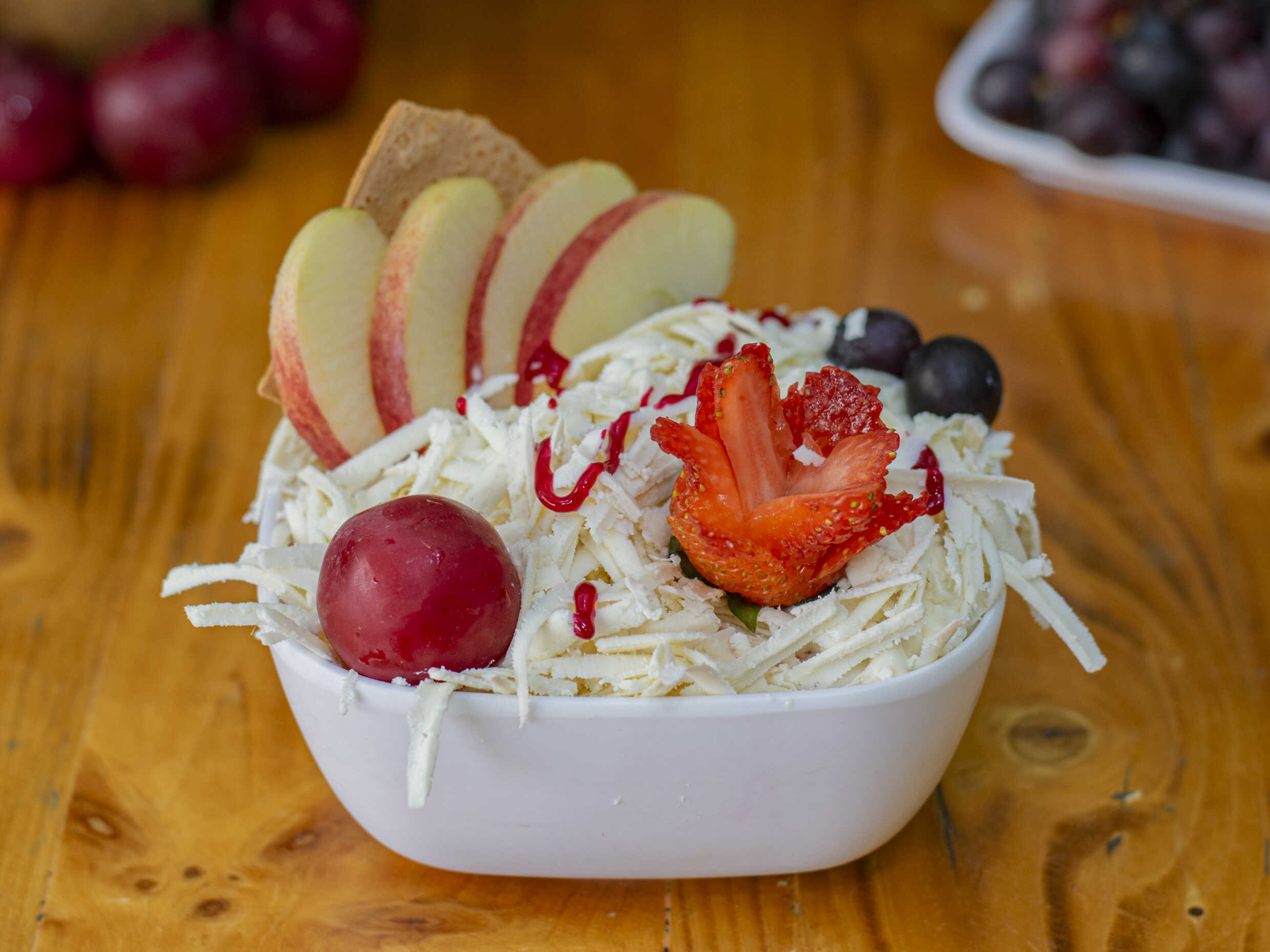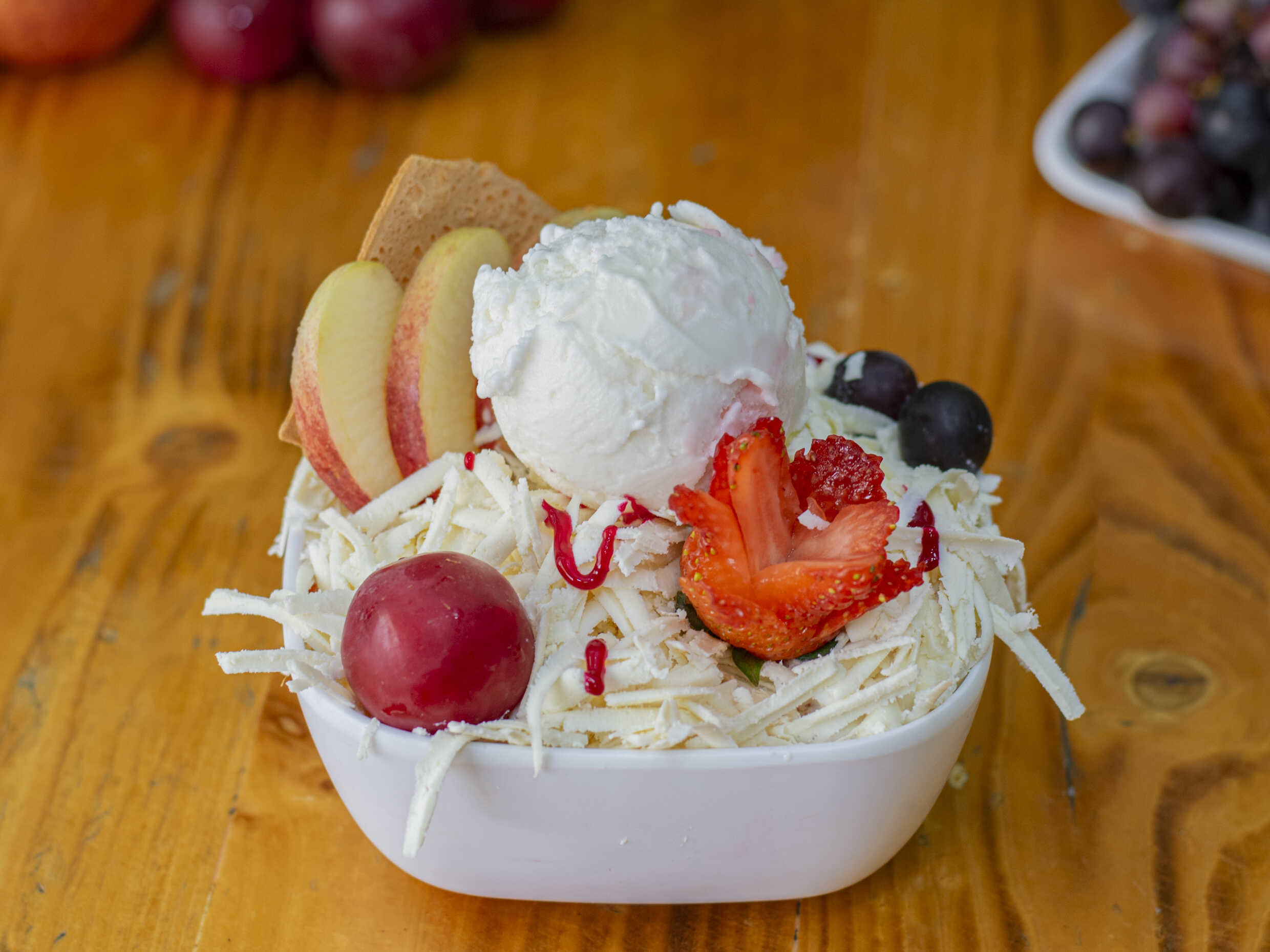 Fruta picada, crema de leche, queso rallado, 2 bolas de helado.