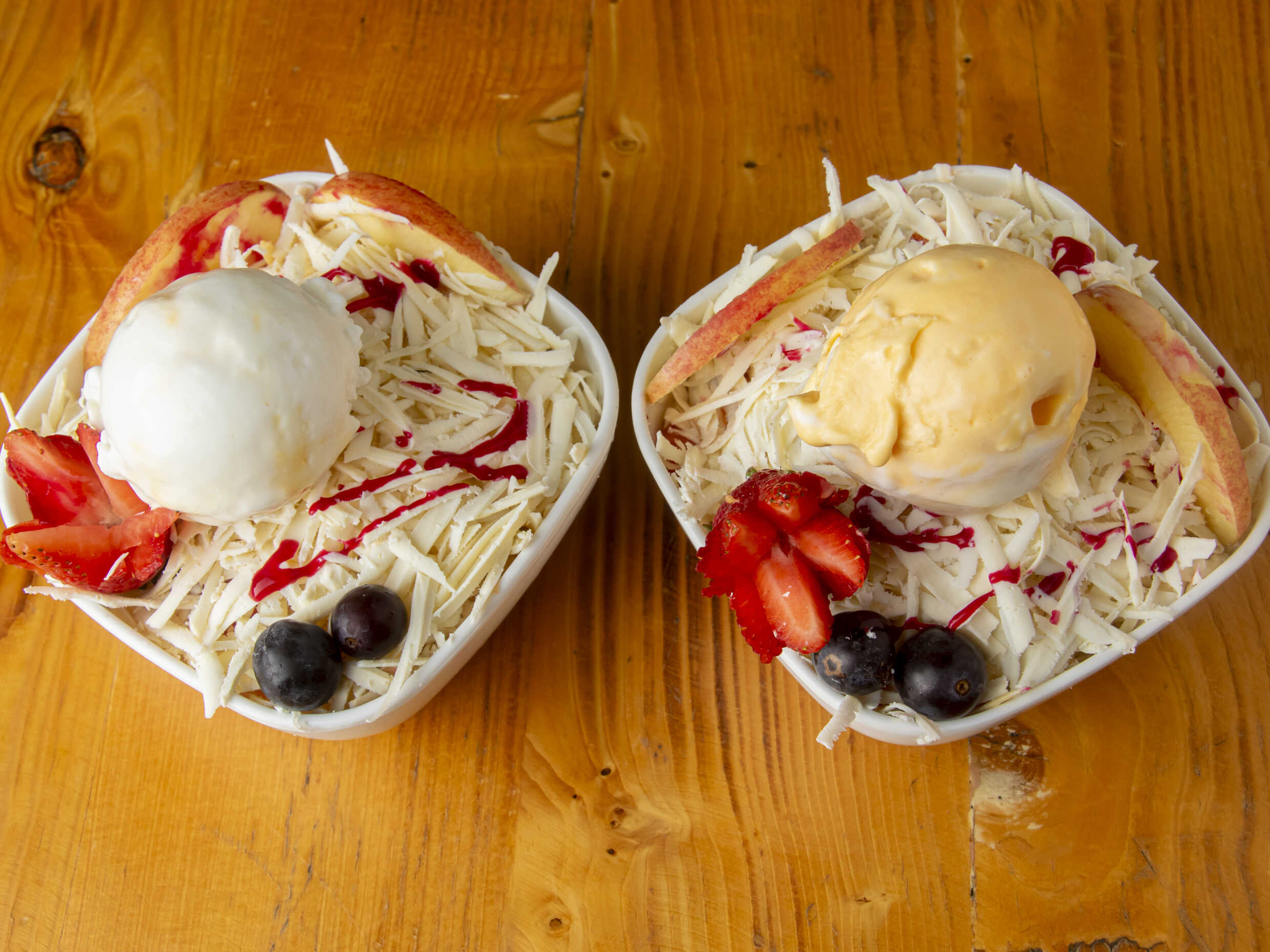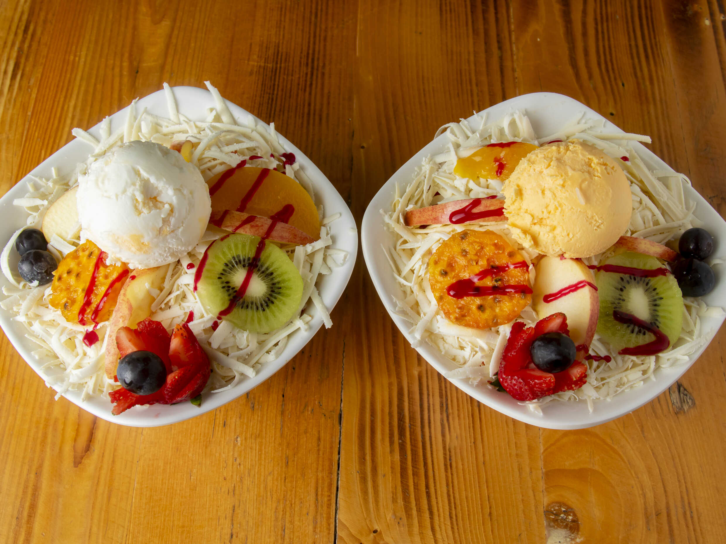 Fruta variada picada, crema de leche, queso rallado, 2 bolas de helado.
