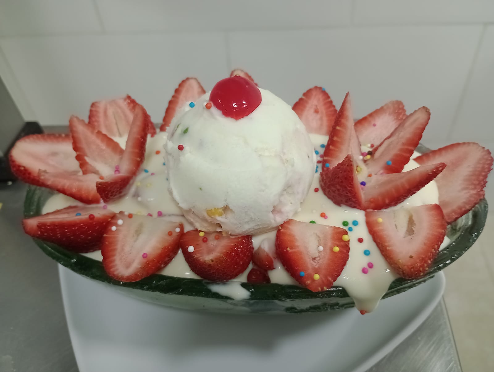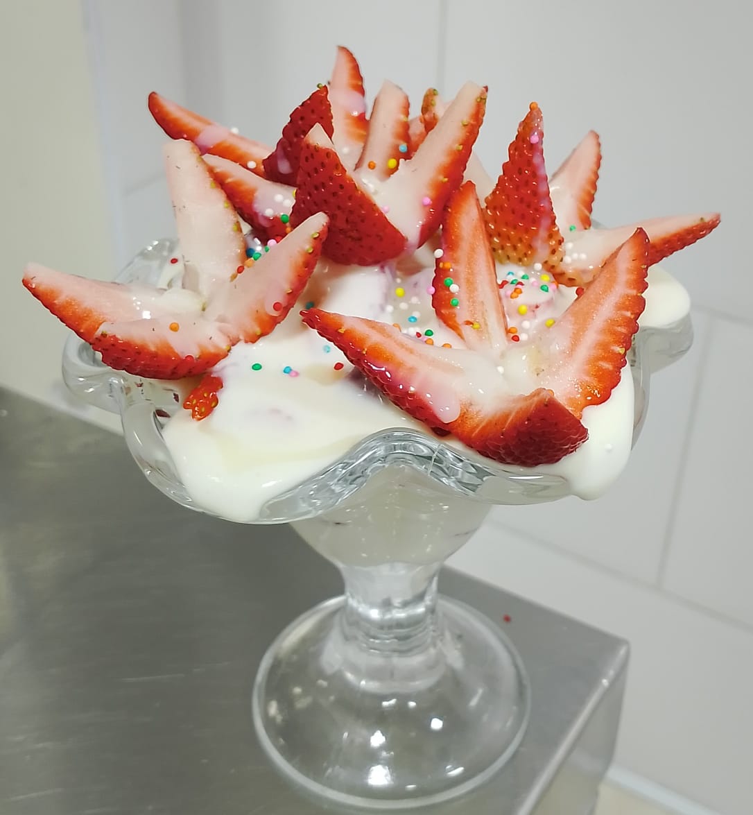 Fresas, crema de leche, dulce de mora, helado y grajeas.