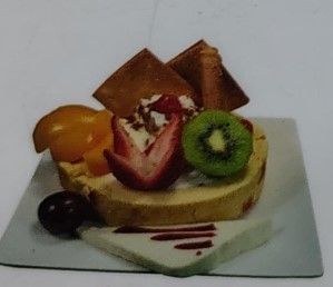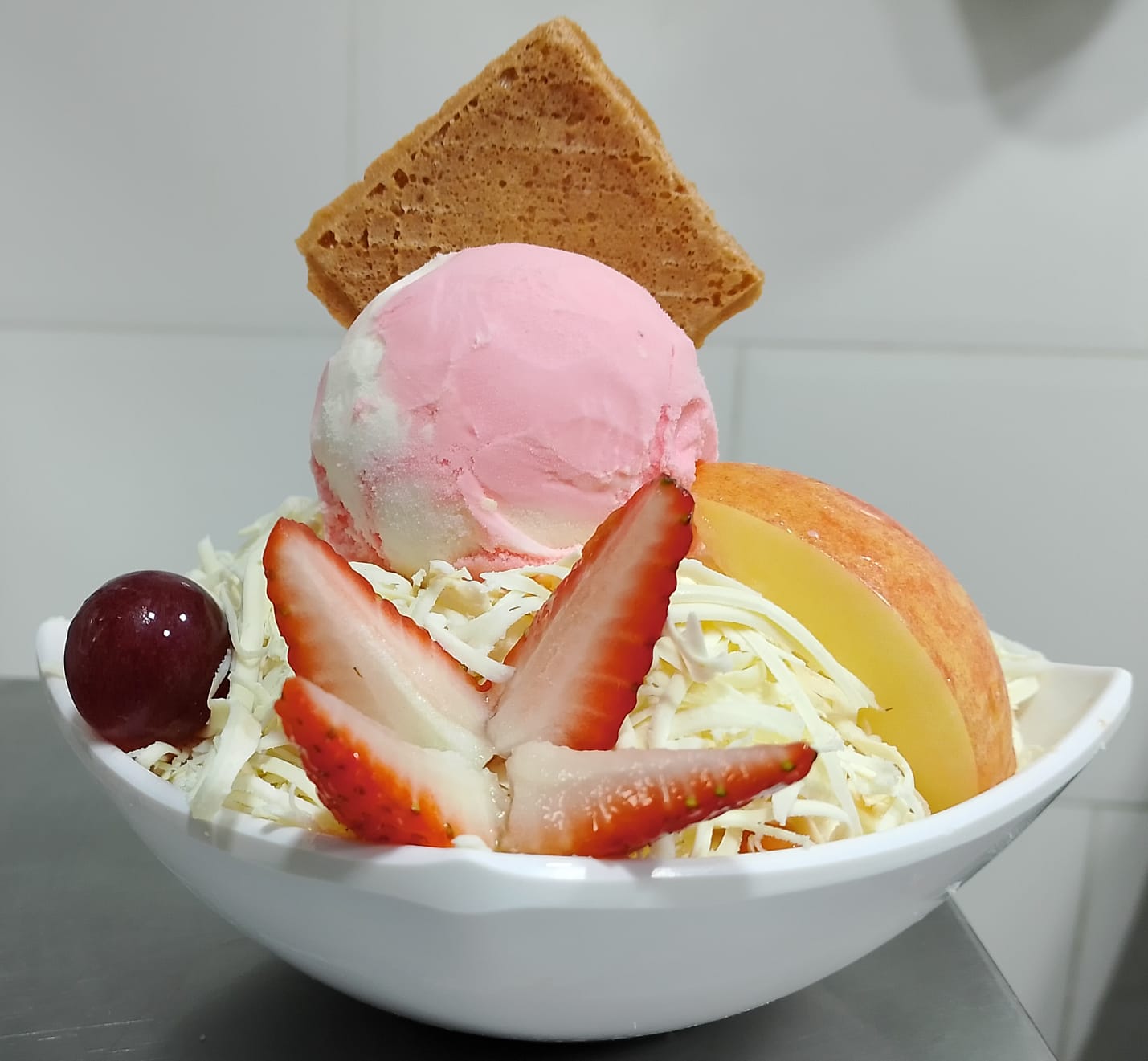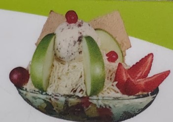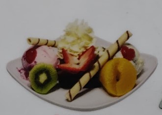 Papaya, melón, mango, banano con crema de leche, queso, durazno, fresa, kiwi, manzana, carambolo, acompañado de una porción de helado, fresas y galleta.